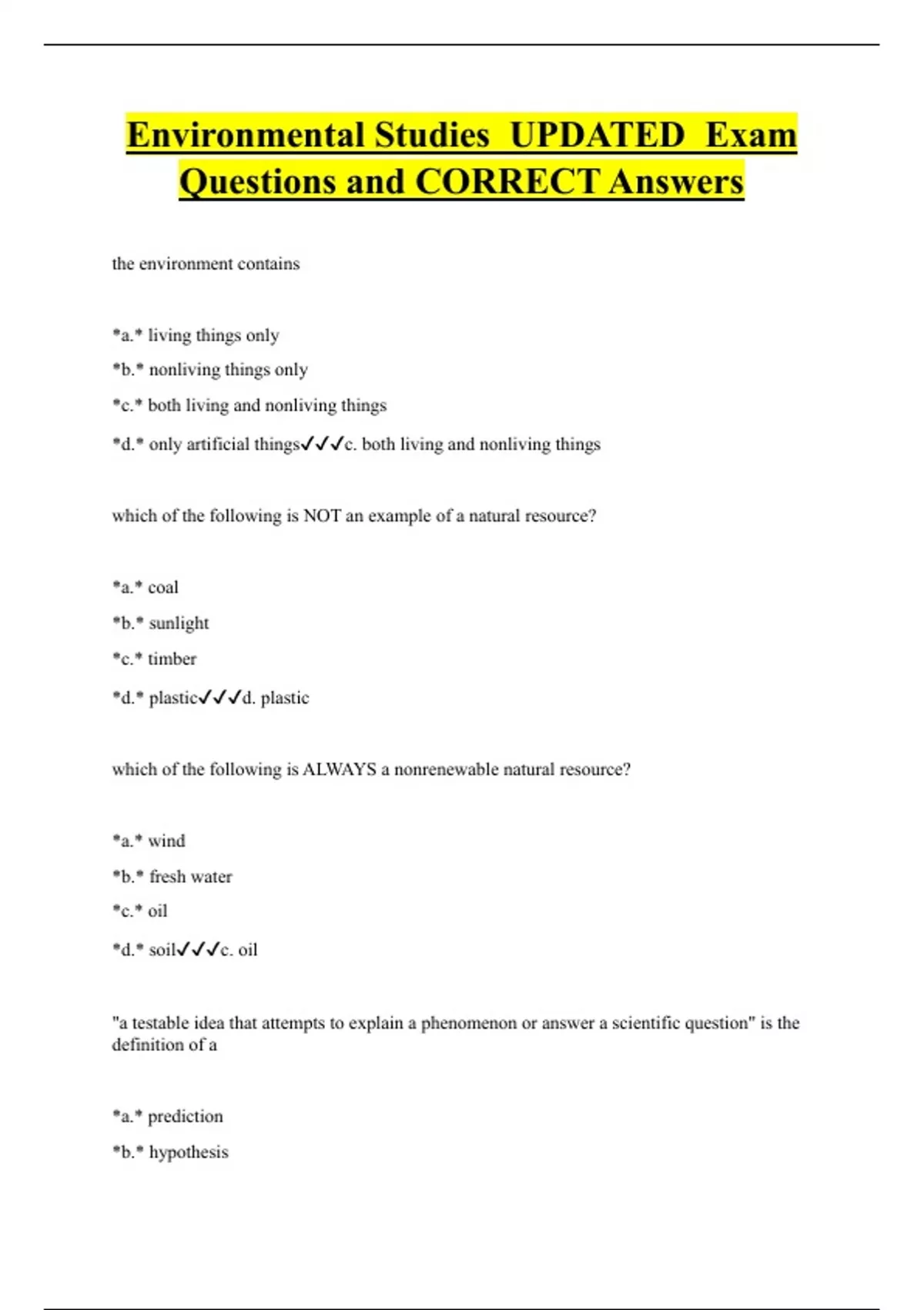 Environmental Studies UPDATED Exam Questions and CORRECT Answers