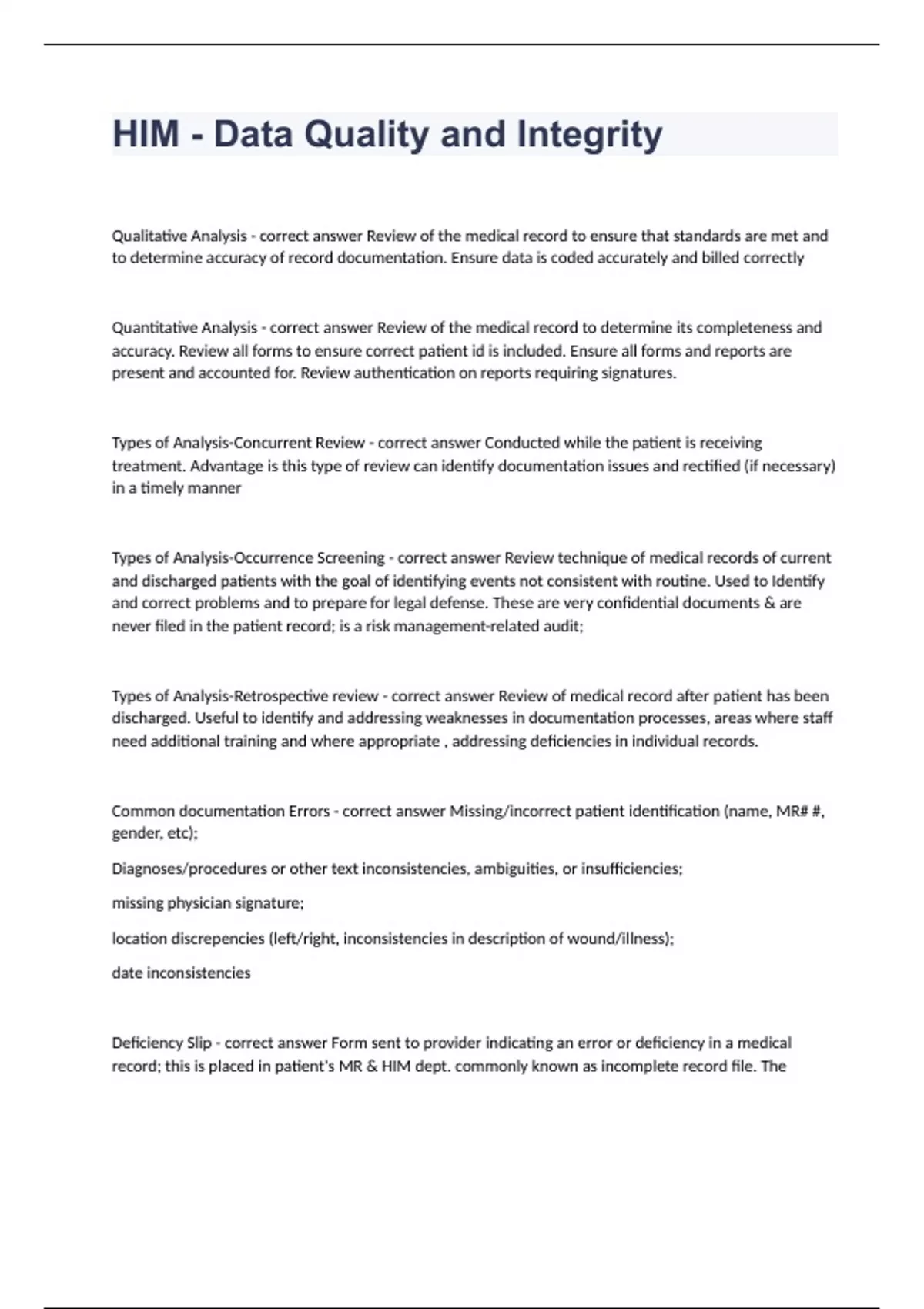 HIM - Data Quality And Integrity Written Exam 2024. Qualitative Analysis - correct answer Review of the medical record to ensure that standards are met and to determine accuracy of record documentation. Ensure data is coded accurately and billed correctly Quantitative Analysis - correct answer Review of the medical record to determine its completeness and accuracy. Review all forms to ensure correct patient id is included. Ensure all forms and reports are present and accounted for. Review authentication on reports requiring signatures. Types of Analysis-Concurrent Review - correct answer Conducted while the patient is receiving treatment. Advantage is this type of review can identify documentation issues and rectified (if necessary) in a timely manner Types of Analysis-Occurrence Screening - correct answer Review technique of medical records of current and discharged patients with the goal of identifying events not consistent with routine. Used to Identify and correct problems and to prepare for legal defense. These are very confidential documents & are never filed in the patient record; is a risk management-related audit;