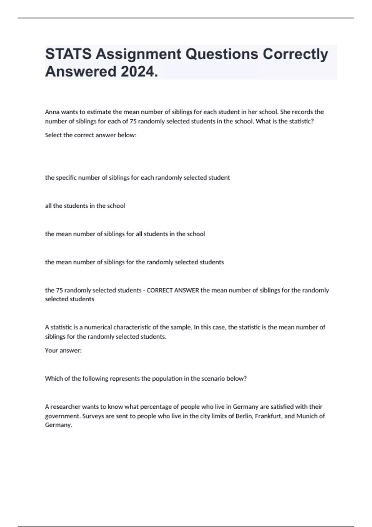 STATS Assignment Questions Correctly Answered 2024. Anna wants to estimate the mean number of siblings for each student in her school. She records the number of siblings for each of 75 randomly selected students in the school. What is the statistic? Select the correct answer below: the specific number of siblings for each randomly selected student all the students in the school the mean number of siblings for all students in the school the mean number of siblings for the randomly selected students the 75 randomly selected students - CORRECT ANSWER the mean number of siblings for the randomly selected students A statistic is a numerical characteristic of the sample. In this case, the statistic is the mean number of siblings for the randomly selected students. Your answer: Which of the following represents the population in the scenario below? A researcher wants to know what percentage of people who live in Germany are satisfied with their government. Surveys are sent to people who live in the city limits of Berlin, Frankfurt, and Munich of Germany. Select the correct answer below: a. People who live in Europe b. People who live in Germany c. People who live in Berlin, Frankfurt, or Munich d. People who live in Berlin - CORRECT ANSWER b. People who live in Germany The researcher wants to learn about the satisfaction of all the people in Germany, so this is the population. A 2016 Pew Research poll estimated the proportion of people supporting each presidential candidate in the fall election. They based their estimates on telephone interviews of 2,010 adults living in all 50 U.S. states. They asked each participant which presidential and vice presidential candidate they support, and used that data to calculate the proportions. What is the statistic in this experiment? Select the correct answer below: The candidate each participant supports.