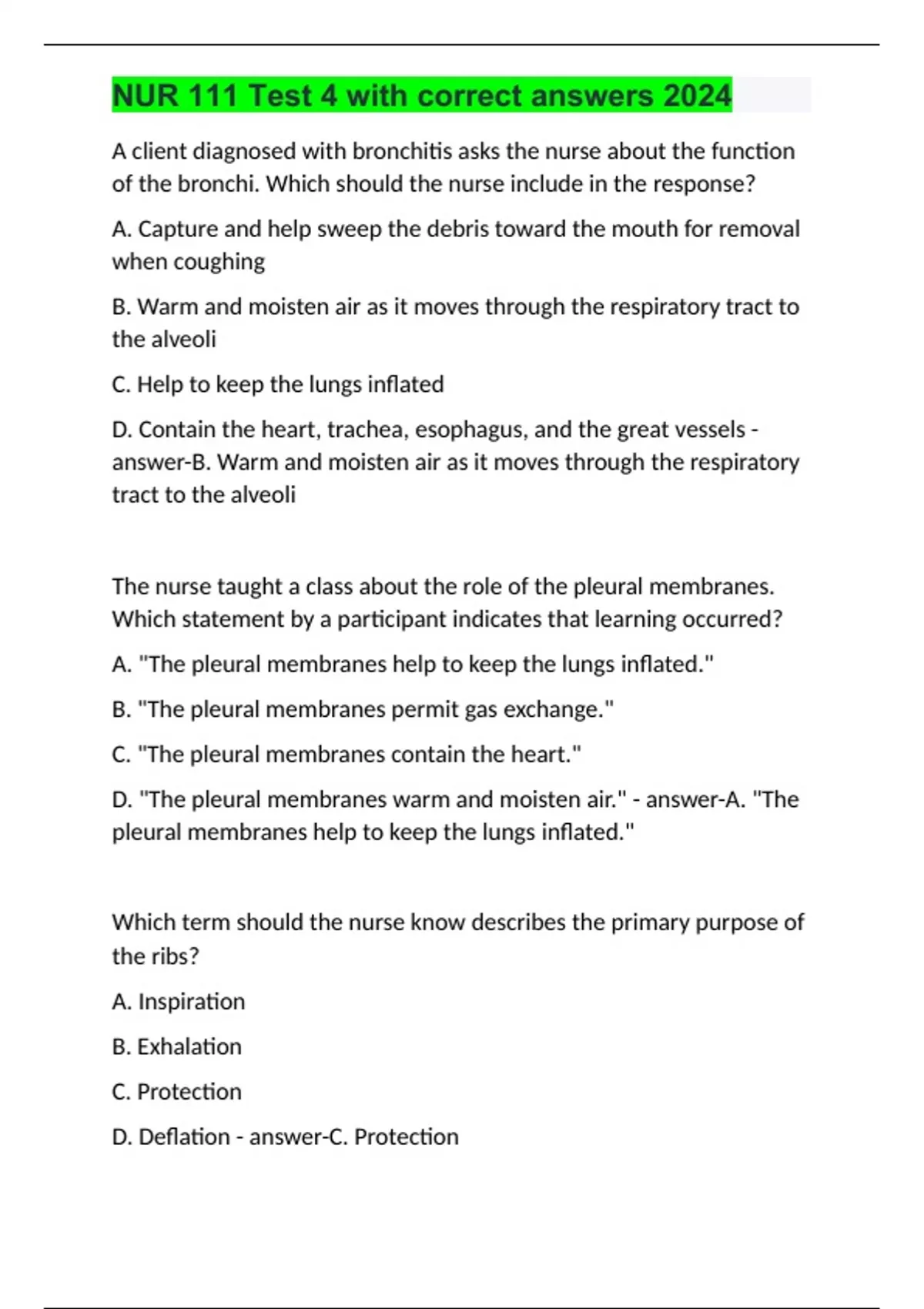 A client diagnosed with bronchitis asks the nurse about the function of the bronchi. Which should the nurse include in the response? A. Capture and help sweep the debris toward the mouth for removal when coughing B. Warm and moisten air as it moves through the respiratory tract to the alveoli C. Help to keep the lungs inflated D. Contain the heart, trachea, esophagus, and the great vessels - answer-B. Warm and moisten air as it moves through the respiratory tract to the alveoli The nurse taught a class about the role of the pleural membranes. Which statement by a participant indicates that learning occurred? A. "The pleural membranes help to keep the lungs inflated." B. "The pleural membranes permit gas exchange." C. "The pleural membranes contain the heart." D. "The pleural membranes warm and moisten air." - answer-A. "The pleural membranes help to keep the lungs inflated." Which term should the nurse know describes the primary purpose of the ribs? A. Inspiration B. Exhalation C. Protection D. Deflation - answer-C. Protection The nurse is assessing an 8-year-old client. Which anatomical difference should the nurse expect to find compared to an adult? (Select all that apply.) A. Smaller nasopharynx B. Soft tracheal cartilage C. Larynx and glottis lower in the neck D. Atrophy of the tonsils E. Small mouth with large tongue - answer-A. Smaller nasopharynx B. Soft tracheal cartilage E. Small mouth with large tongue The nurse is participating in a community health clinic. Which client should the nurse identify as being at risk for compromised oxygenation? (Select all that apply.) A. A 70-year-old woman who eats a well-balanced diet and exercises daily B. A 28-year-old man who smokes with a 10 pack per year history C. A 46-year-old woman with a history of anxiety attacks D. A 64-year-old woman with osteoporosis and limited mobility E. A 56-year-old man who has been working at a textile factory - answer-B. A 28-year-old man who smokes with a 10 pack per year history C. A 46-year-old woman with a history of anxiety attacks D. A 64-year-old woman with osteoporosis and limited mobility E. A 56-year-old man who has been working at a textile factory The nurse is performing a respiratory assessment on a young adult. Which finding is considered an alteration of oxygenation? (Select all that apply.) A. Tachypnea B. Eupnea C. Dyspnea D. Orthopnea E. Retractions - answer-A. Tachypnea C. Dyspnea D. Orthopnea E. Retractions Which method is the most accurate for measuring a client's respiratory rate? A. Measure the respiratory rate for 15 seconds and multiply by 4. B. Measure the respiratory rate for 30 seconds and multiply by 2. C. Measure the respiratory rate for 6 seconds and multiply by 10. D. Measure the respiratory rate for 1 minute. - answer-D. Measure the respiratory rate for 1 minute. The nurse assessing a newborn suspects respiratory distress. Which finding supports the suspicion? A. Intercostal retractions B. Respiratory rate of 44 C. Acrocyanosis at birth D. Abdominal breathing - answer-A. Intercostal retractions Which manifestation should the nurse recognize as a sign of chronic respiratory disease in a client? A. Inspiration to expiration (I:E) ratio of 1:2 B. Crackles noted in bilateral lungs C. Sudden shortness of breath D. Clubbing of the nails - answer-D. Clubbing of the nails The nurse assessing a client suspects a right pneumothorax. Which finding supports the nurse's suspicion? A. Right tracheal shift B. Asymmetry of the chest expansion C.O2 saturation of 94% D. Decreased expansion on the left side of the chest - answer-B. Asymmetry of the chest expansion The nurse is planning care for a client who is receiving oxygen. Which intervention should the nurse include? A. Assess the client for anxiety. B. Suction upper airways each shift. C. Ensure the client is comfortable with the manner of administration. D. Increase the oxygen flow if the client requests. - answer-C. Ensure the client is comfortable with the manner of administration. The nurse is caring for a client with a chest tube. Which intervention should the nurse implement? (Select all that apply.) A. Assess for pain. B. Prescribe pain medications as needed. C. Report hyperresonance with percussion. D. Monitor for air leaks. E. Ensure oxygen is available. - answer-A. Assess for pain. D. Monitor for air leaks. E. Ensure oxygen is available. The nurse is caring for a client with an alteration in oxygenation. Which independent action should the nurse perform? (Select all that apply.) A. Prescribe oxygen therapy. B. Teach about smoking cessation. C. Place the client in high Fowler position. D. Suction the upper airway. E. Order a diet high in iron. - answer-B. Teach about smoking cessation. C. Place the client in high Fowler position. D. Suction the upper airway. A client has crackles and reports increasing shortness of breath. Which action should the nurse take first? A. Place the client in high Fowler position. B. Administer a bronchodilator. C. Assess the respiratory rate. D. Apply oxygen to the client. - answer-A. Place the client in high Fowler position. The nurse preceptor is monitoring the actions of a new graduate nurse caring for a client with a tracheostomy. Which action by the new graduate requires follow-up from the preceptor? A. Assessing for irritation around the stoma B. Suctioning the tracheostomy, then the mouth C. Assessing oxygen saturation D. Suctioning secretions with a clean technique - answer-D. Suctioning secretions with a clean technique The nurse is planning care for a client with weight loss related to respiratory alterations. Which intervention should the nurse include? (Select all that apply.) A. Consult with a dietitian. B. Encourage the client to eat three full meals every day. C. Choose foods the client enjoys. D. Supply nutritional supplements during the day. E. Select foods to meet caloric requirements. - answer-A. Consult with a dietitian. C. Choose foods the client enjoys. D. Supply nutritional supp