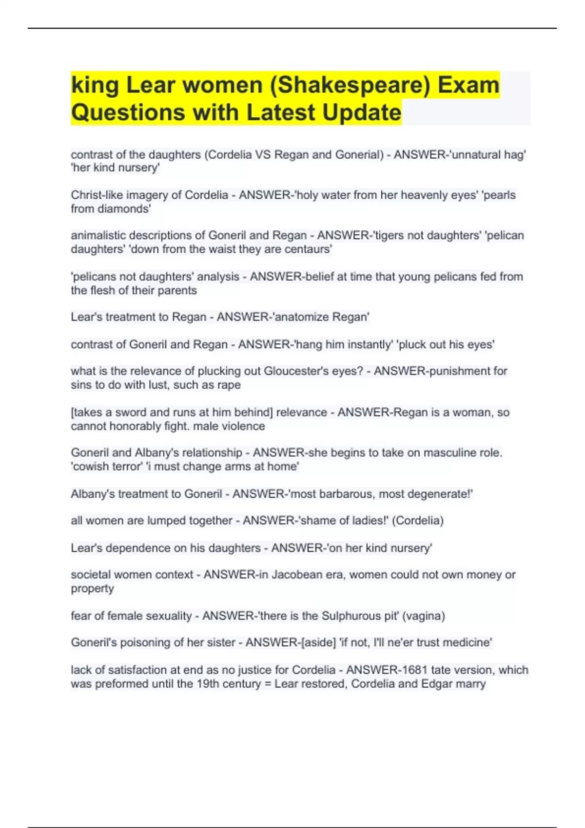 king Lear women (Shakespeare) Exam Questions with Latest Update