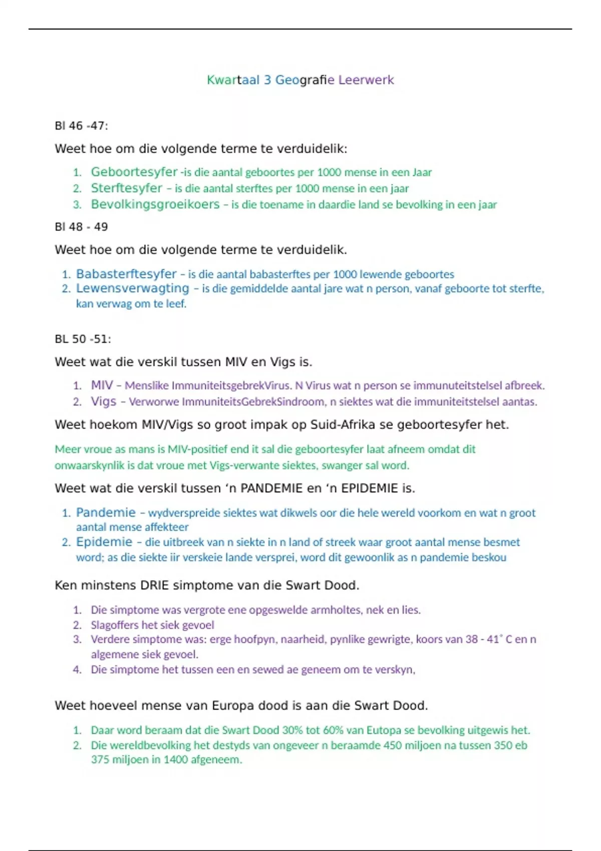 Geboortesyfer, Sterftesyfer, Bevolkingsgroeikoers, Babasterftesyfer, Lewensverwagting, verskil tussen MIV en Vigs, hoekom MIV/Vigs so groot impak op Suid-Afrika se geboortesyfer het, verskil tussen ‘n PANDEMIE en ‘n EPIDEMIE, DRIE simptome van die Swart Dood, hoeveel mense van Europa dood is aan die Swart Dood, waar pokke ontstaan het , Hoe dit na die Kaap versprei het en hoe dit wệreldwyd uitgewis is. Sleutelwoorde, impak het op die geboortesyfer en kinders as geheel, hoekom verhoogde voedselproduksie kan lei tot ‘n toename in bevolkingsgroei