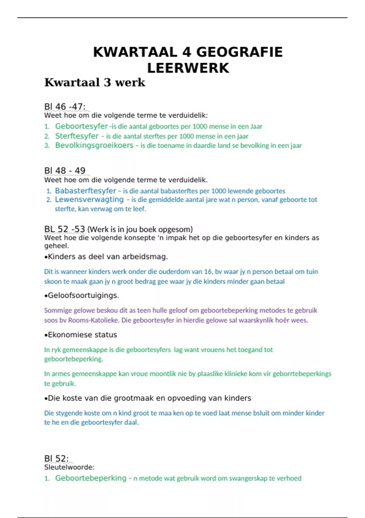 Terme verduidelik, Weet hoe die volgende konsepte ‘n impak het op die geboortesyfer en kinders as geheel, Sleutelwoorde, hoe om lug en water as ‘n hulpbron te verduidelik, 1ste paragraaf van Lug as ‘n hulpbron baie goed.(Veral die getalle in die paragraaf), watersiklus, maniere waarop ons die omgewing kan bewaar, wat eko-toerisme is ek ken 3 voorbeelde, Misbruik van grond, Oorsake van gronderosie, Weet hoe om ‘n sirkel-grafiek te lees. hoeveel water dit vat om die volgende produkte te maak.