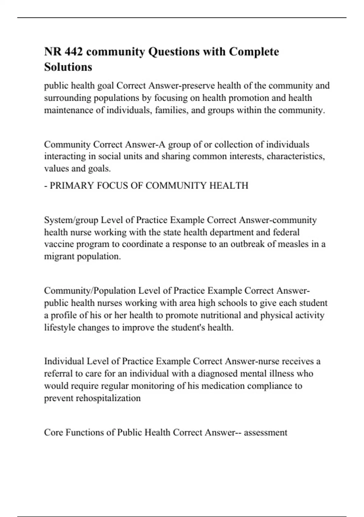 public health goal Correct Answer-preserve health of the community and surrounding populations by focusing on health promotion and health maintenance of individuals, families, and groups within the community. Community Correct Answer-A group of or collection of individuals interacting in social units and sharing common interests, characteristics, values and goals. - PRIMARY FOCUS OF COMMUNITY HEALTH System/group Level of Practice Example Correct Answer-community health nurse working with the state health department and federal vaccine program to coordinate a response to an outbreak of measles in a migrant population. Community/Population Level of Practice Example Correct Answer-public health nurses working with area high schools to give each student a profile of his or her health to promote nutritional and physical activity lifestyle changes to improve the student's health.