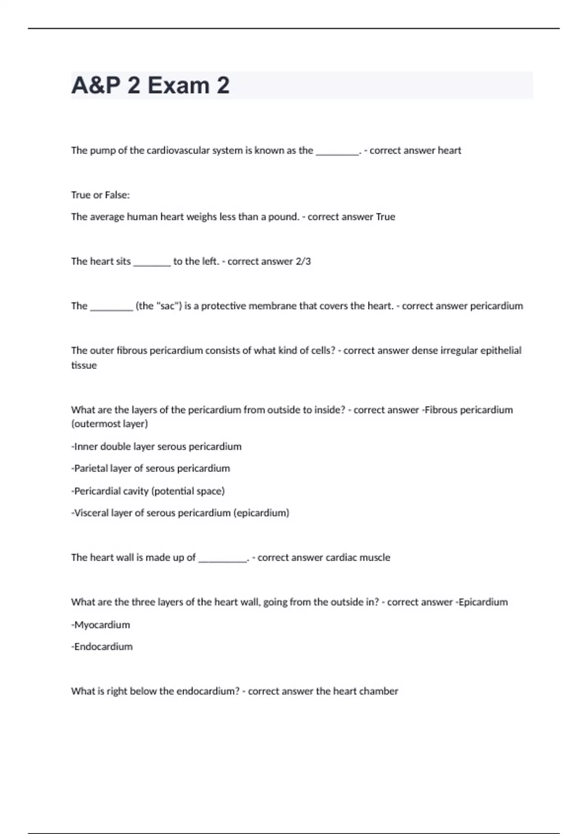 A&P 2 Exam 2 Questions with complete solution A&P 2 Exam 2 The pump of the cardiovascular system is known as the ________. - correct answer heart True or False: The average human heart weighs less than a pound. - correct answer True The heart sits _______ to the left. - correct answer 2/3 The ________ (the "sac") is a protective membrane that covers the heart. - correct answer pericardium The outer fibrous pericardium consists of what kind of cells? - correct answer dense irregular epithelial tissue What are the layers of the pericardium from outside to inside? - correct answer -Fibrous pericardium (outermost layer) -Inner double layer serous pericardium -Parietal layer of serous pericardium -Pericardial cavity (potential space) -Visceral layer of serous pericardium (epicardium)