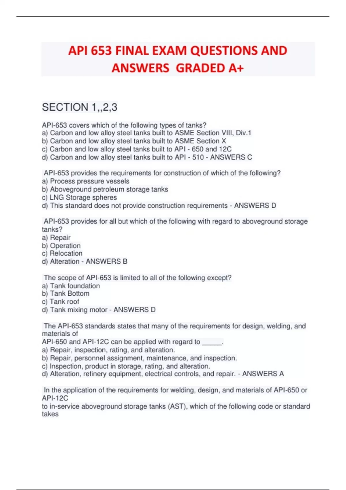 API 653 FINAL EXAM QUESTIONS AND ANSWERS GRADED A+ SECTION 1,,2,3 API-653 covers which of the following types of tanks? a) Carbon and low alloy steel tanks built to ASME Section VIII, Div.1 b) Carbon and low alloy steel tanks built to ASME Section X c) Carbon and low alloy steel tanks built to API - 650 and 12C d) Carbon and low alloy steel tanks built to API - 510 - ANSWERS C API-653 provides the requirements for construction of which of the following? a) Process pressure vessels b) Aboveground petroleum storage tanks c) LNG Storage spheres d) This standard does not provide construction requirements - ANSWERS D API-653 provides for all but which of the following with regard to aboveground storage tanks? a) Repair b) Operation c) Relocation d) Alteration - ANSWERS B The scope of API-653 is limited to all of the following except? a) Tank foundation b) Tank Bottom c) Tank roof d) Tank mixing motor - ANSWERS D The API-653 standards states that many of the requirements for design, welding, and materials of API-650 and API-12C can be applied with regard to _____. a) Repair, inspection, rating, and alteration. b) Repair, personnel assignment, maintenance, and inspection. c) Inspection, product in storage, rating, and alteration. d) Alteration, refinery equipment, electrical controls, and repair. - ANSWERS A In the application of the requirements for welding, design, and materials of API-650 or API-12C to in-service aboveground storage tanks (AST), which of the following code or standard takes precedence? a) ASME Section VIII, Pressure Vessels b) API-12C c) API-653 d) API-650 - ANSWERS C The API-653 Standard may only be applied to aboveground storage tanks (AST) that have been constructed to and meet the requirements of API-650. a) True b) False - ANSWERS B The use of API-653 is intended for organizations that have personnel who are technically trained and experienced in which of the following? a) All ASME, AWS, ASNT, and API Codes and Standards b) Tank design, fabrication, repair, construction, and inspection c) Refinery operations, safety requirements, personnel management, and refinery design d) Mechanical integrity program, OSHA regulations compliance program, and Process Safety Management - ANSWERS B When design and construction details are not given and not available in the original construction standard, then details that will provide a level of integrity equal to the current edition of what Code or Standard must be used? a) ASME Section VIII, Division 1, Pressure Vessels b) ASME Section VIII Division 2, Alternative Rules for Pressure Vessels c) API- 650, Welded Steel Tanks for Oil Storage d) API-12C Steel Storage Tanks for Oil Storage - ANSWERS C Ultimate responsibility for compliance with this standard rests with ____? a) The Owner/Operator b) The Owner/Operator's Inspector c) The repair organization of the Owner/Operator d) The manufacturer of the AST - ANSWERS A According to API-653, if any provision presents a direct or implied conflict with any statutory regulation, the regulation governs. What governs if API-653 requirements are more stringent than the statutory regulation? a) The statutory regulation applies in all cases b) The conflict must be submitted to the American Petroleum Institute for resolution c) The owner/operator has the option of applying the requirement best suited to the situation d) The API-653 requirements shall govern - ANSWERS D Safe working practices shall comply with what requirements concerning confined space entry? a) Procedures must comply with any trade developed safety precautions b) Procedures must comply with any federal or state regulations c) Procedures need only comply with owner/operator/s requirements d) Procedures need only comply with NFPA requirements - ANSWERS B SECTION 4 When must an evaluation, to determine the suitability for continued use, be conducted? a) Evaluations shall be conducted when a tank inspection reveals a change has occurred from the original physical condition of the tank. b) Evaluations shall be conducted at least annually c) Evaluations shall be conducted at an interval not to exceed the calculated tank inspection frequency. d) Evaluations shall be conducted once each ten years of service - ANSWERS A What factors are required for consideration when performing an evaluation for continued use of an AST? a) Only those listed in API-65