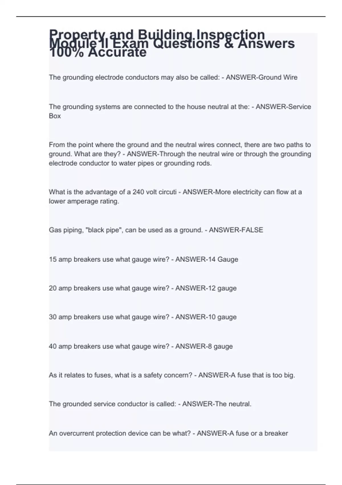 The grounding electrode conductors may also be called: - ANSWER-Ground Wire The grounding systems are connected to the house neutral at the: - ANSWER-Service Box From the point where the ground and the neutral wires connect, there are two paths to ground. What are they? - ANSWER-Through the neutral wire or through the grounding electrode conductor to water pipes or grounding rods. What is the advantage of a 240 volt circuti - ANSWER-More electricity can flow at a lower amperage rating. Gas piping, "black pipe", can be used as a ground. - ANSWER-FALSE 15 amp breakers use what gauge wire? - ANSWER-14 Gauge 20 amp breakers use what gauge wire? - ANSWER-12 gauge 30 amp breakers use what gauge wire? - ANSWER-10 gauge 40 amp breakers use what gauge wire? - ANSWER-8 gauge As it relates to fuses, what is a safety concern? - ANSWER-A fuse that is too big. The grounded service conductor is called: - ANSWER-The neutral.