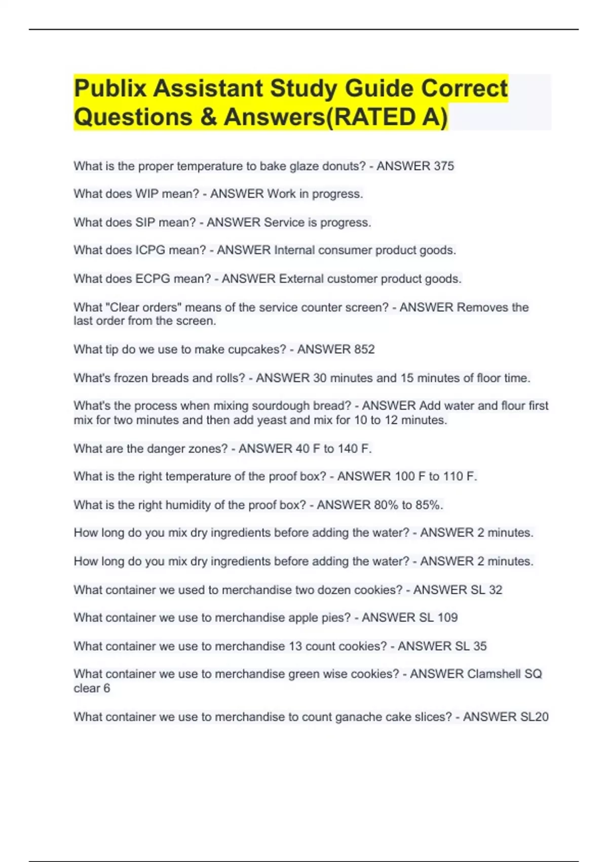 Publix Assistant Study Guide Correct Questions & Answers(RATED A)
