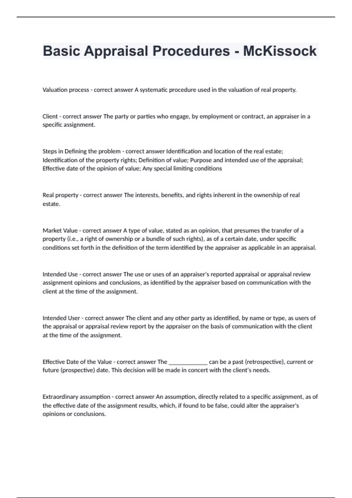 Basic Appraisal Procedures - McKissock Question and answers rated A+ Basic Appraisal Procedures - McKissock Valuation process - correct answer A systematic procedure used in the valuation of real property. Client - correct answer The party or parties who engage, by employment or contract, an appraiser in a specific assignment. Steps in Defining the problem - correct answer Identification and location of the real estate; Identification of the property rights; Definition of value; Purpose and intended use of the appraisal; Effective date of the opinion of value; Any special limiting conditions Real property - correct answer The interests, benefits, and rights inherent in the ownership of real estate. Market Value - correct answer A type of value, stated as an opinion, that presumes the transfer of a property (i.e., a right of ownership or a bundle of such rights), as of a certain date, under specific conditions set forth in the definition of the term identified by the appraiser as applicable in an appraisal. Intended Use - correct answer The use or uses of an appraiser's reported appraisal or appraisal review assignment opinions and conclusions, as identified by the appraiser based on communication with the client at the time of the assignment. Intended User - correct answer T