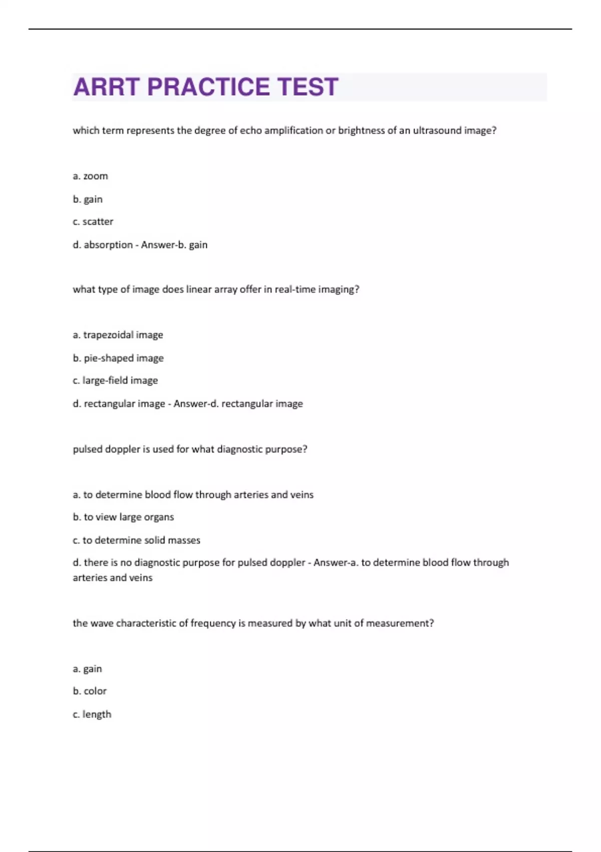 which term represents the degree of echo amplification or brightness of an ultrasound image? a. zoom b. gain c. scatter d. absorption - Answer-b. gain what type of image does linear array offer in real-time imaging? a. trapezoidal image b. pie-shaped image c. large-field image d. rectangular image - Answer-d. rectangular image pulsed doppler is used for what diagnostic purpose? a. to determine blood flow through arteries and veins b. to view large organs c. to determine solid masses d. there is no diagnostic purpose for pulsed doppler - Answer-a. to determine blood flow through arteries and veins the wave characteristic of frequency is measured by what unit of measurement? a. gain b. color c. lengthd. hertz - Answer-d. hertz the comet tail image indicated which of the following to the ultrasound technician? a. the edge of the organ b. artifact c. the sign of an abscess d. the right depth of the transducer - Answer-b. artifact you are performing an ultrasound exam of the abdomen and pelvis of a patient with an unexplained fever. you understand the purpose of the exam is to look for which of the following? a. abscess, inflammation, or mass b. enlarged lymph nodes c. both a and b d. neither a nor b - Answer-c. both a and b what is an appropriate way to store color images of an ultrasound scan? a. images can be scanned and stored in the memory of the equipment in gray scale, color, or real-time imaging b. images must be printed immediately because storage and memory are unreliable c. images can be stored as numbers or images d. images can only be stored in gray scale in the memory of the equipment - Answer-a. images can be scanned and stored in the memory of the equipment in gray scale, color, or real-time imaging which term defines the first beam transmitting from the transducer? a. the reflected beam b. the incident beamc. the transmitted beam d. the harmonic beam - Answer-b. the incident beam the purpose of a diagnostic ultrasound transducer is best described in which of the following descriptions? a. it is easy on the technician's hand and can be easily gripped b. it is shaped with a round end for the best imaging c. it is used to convert electrical energy into sound energy and sound energy to electrical energy d. the transducer really has no definite purpose; the computer equipment actually does the scan - Answer-c. it is used to convert electrical energy into sound energy and sound energy to electrical energy what is the most significant side effect of sound waves on the patient who is undergoing an ultrasound? a. there is only minimal possibility of adverse effects from the heat produced by the sound wave b. there is no possibility of adverse effect from an ultrasound exam c. neonates have the only chance of any adverse side effects from an ultrasound d. there are serious side effects from having an ultrasound, and the technician must explain those to the patient before every exam - Answer-a. there is only minimal possibility of adverse effects from the heat produced by the sound wave which statement best defines the ALARA principle? a. the principle states that the lowest reasonable energy should be used to produce the clearest image b. the principle states that the highest reasonable energy should be used to produce the clearest image c. the principle states the level of energy is not included in when deciding what technique to use to get a clear image d. the principle states that the lowest reasonable energy should be used with minimal exposure for obtaining the clearest image - Answer-d. the principle states that the lowest reasonable energy should be used with minimal exposure for obtaining the clearest image