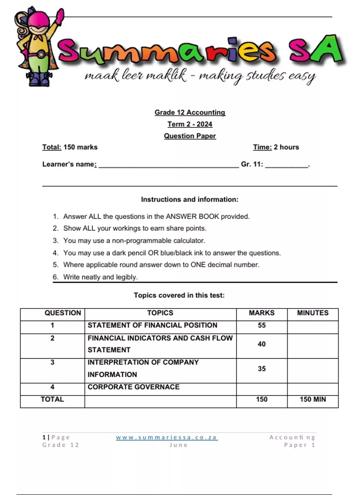 Grade 12 Accounting June Paper 1 and Memo: Total:  150 Marks.      Time:  150min Contents of the exam paper contains the following details: Question 1:  Statement of Financial position (55 marks) Question 2:  Financial indicators and cash flow statement (40 marks) Question 3:  Interpretation of company information (35 marks) Question 4:  Corporate governance (20 marks) This is a practice paper with memorandum meant to test the student's knowledge, and will not be the same paper written for the exam. DAN SMI