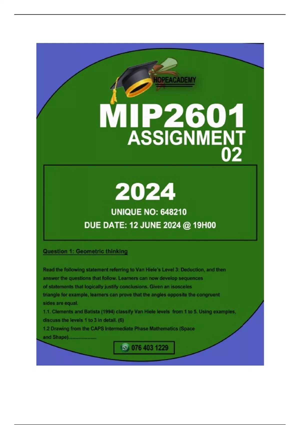 MIP2601 ASSIGNMENT 02 UNIQUE NUMBER 648210 DUE 12JUNE 2024 TIME 19:00 Question 1: Geometric thinking Read the following statement referring to Van Hiele’s Level 3: Deduction, and then answer the questions that follow. Learners can now develop sequences of statements that logically justify conclusions. Given an isosceles triangle for example, learners can prove that the angles opposite the congruent sides are equal. 1.1. Clements and Batista (1994) classify Van Hiele levels from 1 to 5. Using examples, discuss the levels 1 to 3 in detail. (6)