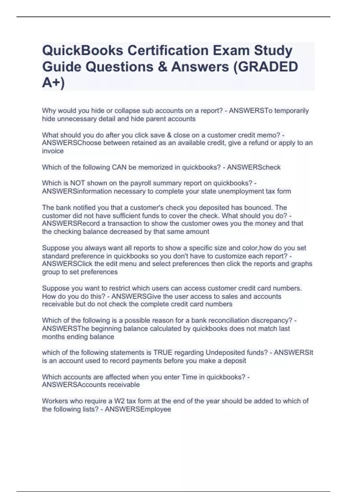 QuickBooks Certification Exam Study Guide Questions & Answers (GRADED A+)