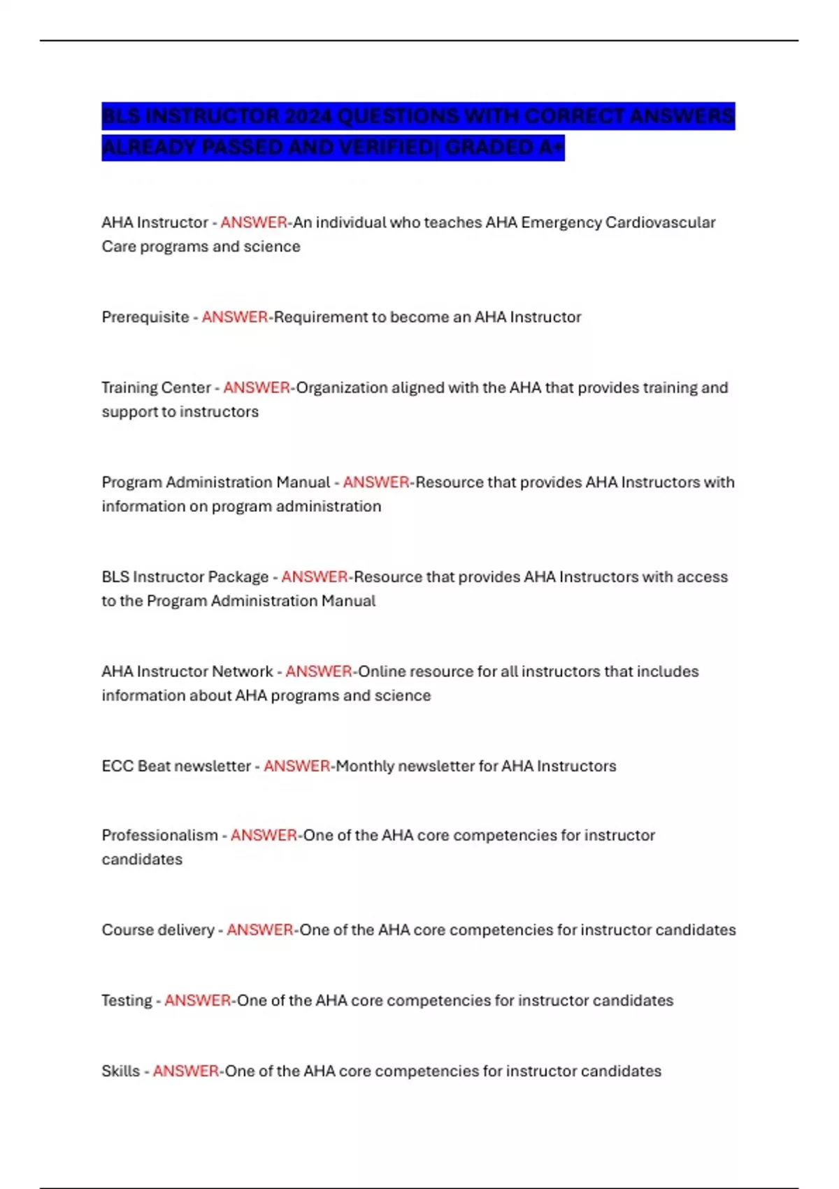 BLS INSTRUCTOR 2024 QUESTIONS WITH CORRECT ANSWERS ALREADY PASSED AND