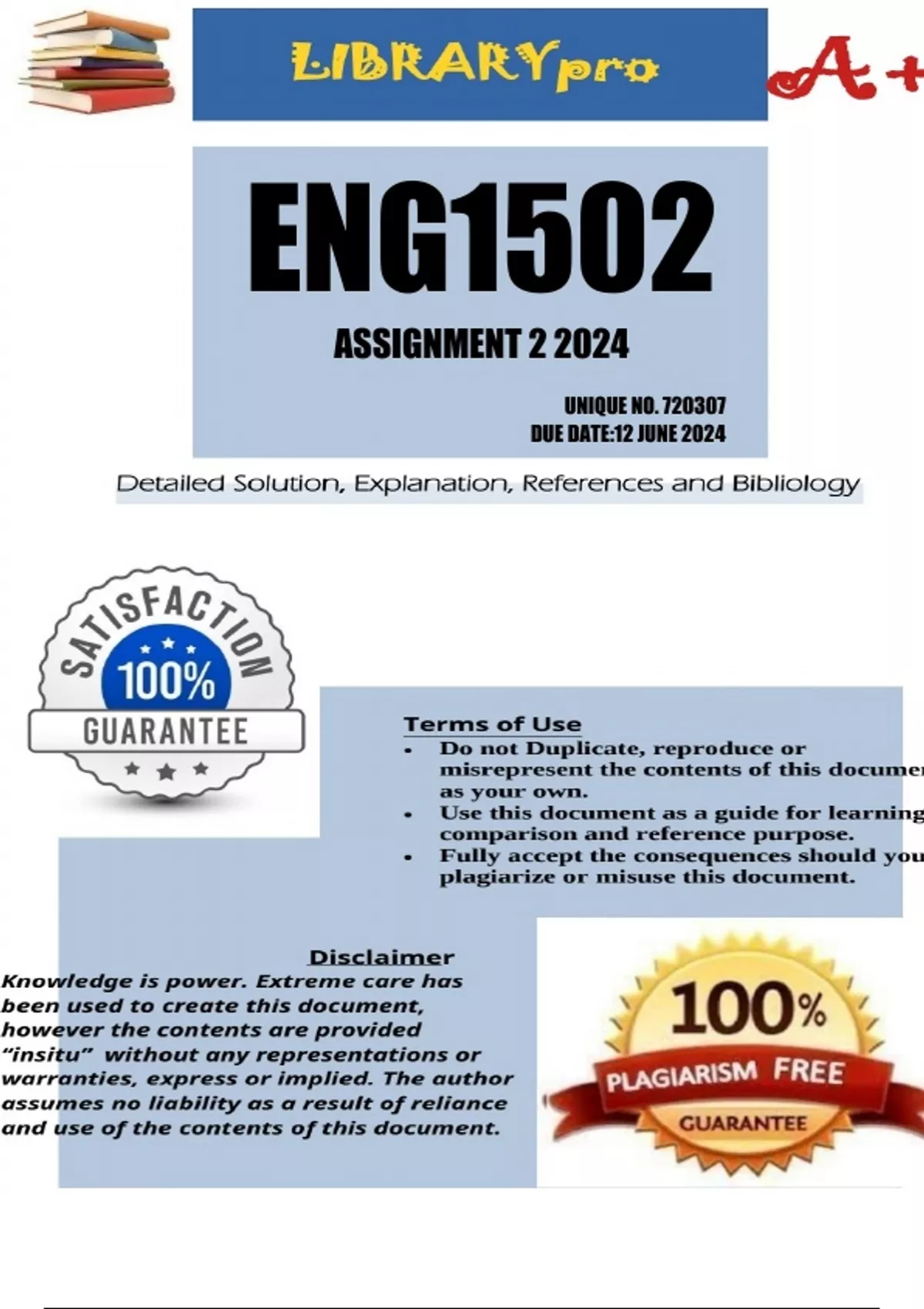 ENG1502 Assignment 2 2024 (Unique No. 720307) - DUE 12 June 2024 ;100 % TRUSTED workings, explanations and solutions. For assistance call or W.h.a.t.s.a.p.p us on ...(.+.2.5.4.7.7.9.5.4.0.1.3.2)........... Question 1 1.1 The following words can post challenges with pronunciation. Based on your knowledge of English as an alphabetic language, write the phonemic transcription of each word. i. Ask ii. Mischievous iii. Draught iv. Nauseous v. Buffet. N.B. Use slashes and not brackets to enclose your transcription. [Total: 10 marks] Question 2 2.1 Languages are known for borrowing words from one another. i) In your own words, explain what you understand by the process of borrowing words from one language to another. (2 marks) ii) Provide three words which illustrate the effect of borrowing on pronunciation. For example, in the word ‘buffet’ which has been borrowed from French, the final ‘t’ is silent in French, yet most people tend to pronounce the ‘t’ in English. (3 marks) iii) Provide two words, from your own language, which have been borrowed from another language and show how the spelling of the borrowed words has been changed in the borrowing language. Indicate the language from which the borrowed words originate. (5 marks) (Remember to provide an English explanation to the meaning of the word). [Total: 10 marks] Question 3 Morphology 3.1 The morphological structure of a word impacts on its meaning. The word ‘connect’ can have different meanings depending on its morphological structure. Write five grammatically correct sentences in which you use it to show different meaning. Identify the part of speech of the word in each sentence. For example: Connect – verb. - I will connect the pieces of the toy tomorrow. (verb) Hint: the morphology of the words, or how they were formed should guide you to identify the part of speech. (10 marks) [Total: 10 marks] Question 4 4.1. Ambiguity refers to a situation where a word, phrase, sentence is open to more than one possible interpretation. The following statement can be interpreted in two words that are ambiguous. Jimmy told John to park his car in the garage of the new house that he bought. a) Identify the two examples of ambiguity in this statement. (2 marks) b) Explain in detail how the two words are ambiguous in this context. (4 marks) c) Provide your own statement that shows ambiguity and explain what makes it ambiguous. (4 marks) [Total: 10 marks] Question 5 Connotative and Denotative Meaning Connotation and denotation are the two of the principal ways for describing semantic meaning. 5.1 Explain the difference between connotative and denotative meanings. Provide an example for each meaning to substantiate your answer. (4 marks) 5.2 The line ‘son of the soil’ in the picture below is an example of how words or statements have both denotative and connotative meanings. Explain in detail how this line can have both denotative and connotative meanings. In your explanation refer to the picture to substantiate your argument.