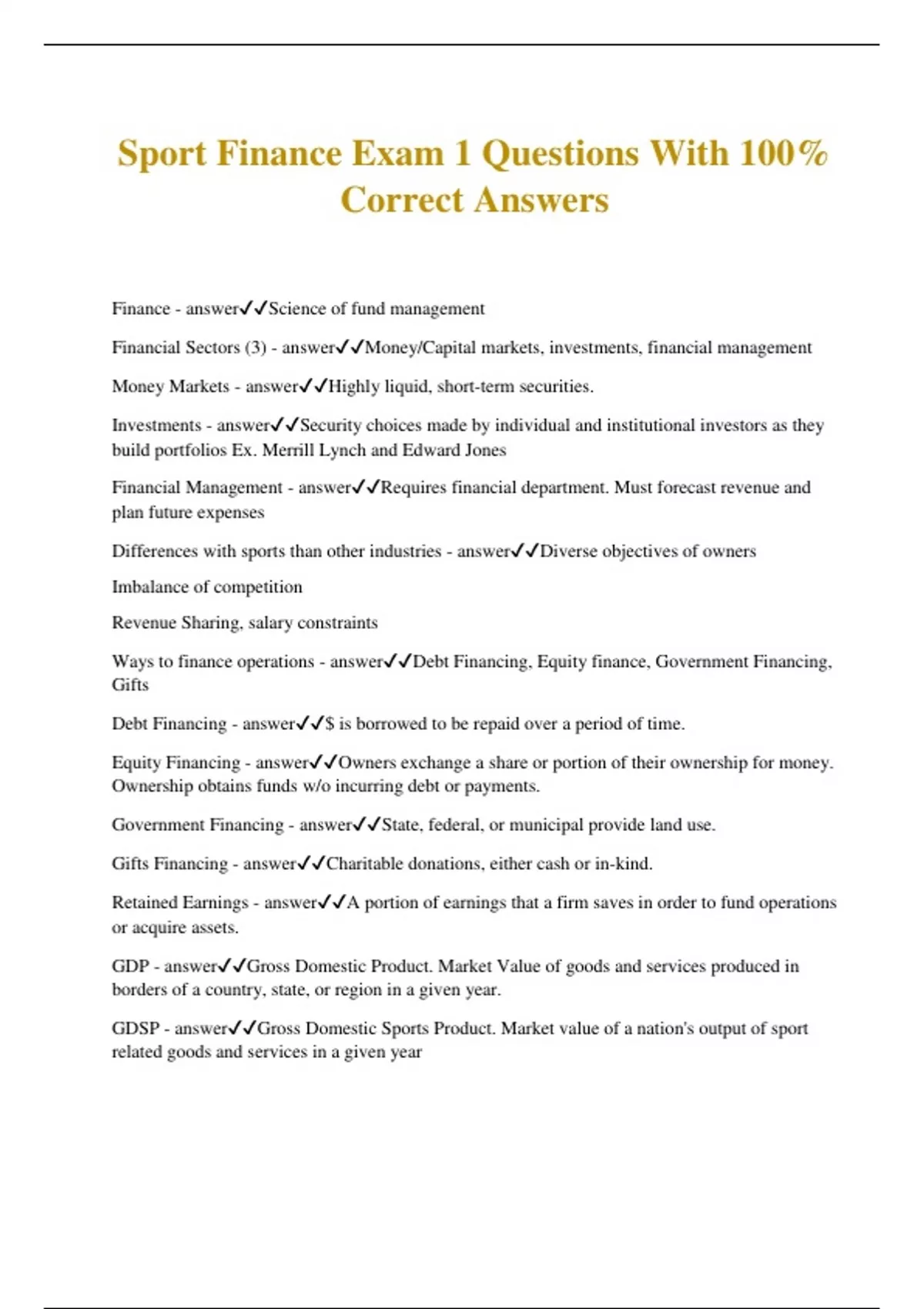 Sport Finance Exam 1 Questions With 100% Correct Answers Finance - answerScience of fund management Financial Sectors (3) - answerMoney/Capital markets, investments, financial management Money Markets - answerHighly liquid, short-term securities. Investments - answerSecurity choices made by individual and institutional investors as they build portfolios Ex. Merrill Lynch and Edward Jones Financial Management - answerRequires financial department. Must forecast revenue and plan future expenses Differences with sports than other industries - answerDiverse objectives of owners Imbalance of competition Revenue Sharing, salary constraints Ways to finance operations - answerDebt Financing, Equity finance, Government Financing, Gifts Debt Financing - answer$ is borrowed to be repaid over a period of time. Equity Financing - answerOwners exchange a share or portion of their ownership for money. Ownership obtains funds w/o incurring debt or payments. Government Financing - answerState, federal, or municipal provide land use. Gifts Financing - answerCharitable donations, either cash or in-kind. Retained Earnings - answerA portion of earnings that a firm saves in order to fund operations or acquire assets. GDP - answerGross Domestic Product. Market Value of goods and services produced in borders of a country, state, or region in a given year. GDSP - answerGross Domestic Sports Product. Market value of a nation's output of sport related goods and services in a given year
