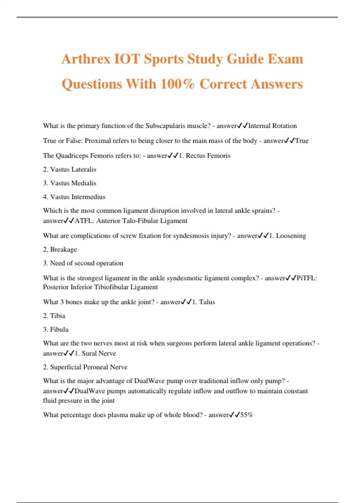 Arthrex IOT Sports Study Guide Exam Questions With 100% Correct Answers What is the primary function of the Subscapularis muscle? - answerInternal Rotation True or False: Proximal refers to being closer to the main mass of the body - answerTrue The Quadriceps Femoris refers to: - answer1. Rectus Femoris 2. Vastus Lateralis 3. Vastus Medialis 4. Vastus Intermedius Which is the most common ligament disruption involved in lateral ankle sprains? - answerATFL: Anterior Talo-Fibular Ligament What are complications of screw fixation for syndesmosis injury? - answer1. Loosening 2. Breakage 3. Need of second operation What is the strongest ligament in the ankle syndesmotic ligament complex? - answerPiTFL: Posterior Inferior Tibiofibular Ligament What 3 bones make up the ankle joint? - answer1. Talus 2. Tibia 3. Fibula What are the two nerves most at risk when surgeons perform lateral ankle ligament operations? - answer1. Sural Nerve 2. Superficial Peroneal Nerve What is the major advantage of DualWave pump over traditional inflow only pump? - answerDualWave pumps automatically regulate inflow and outflow to maintain constant fluid pressure in the joint What percentage does plasma make up of whole blood? - answer55%