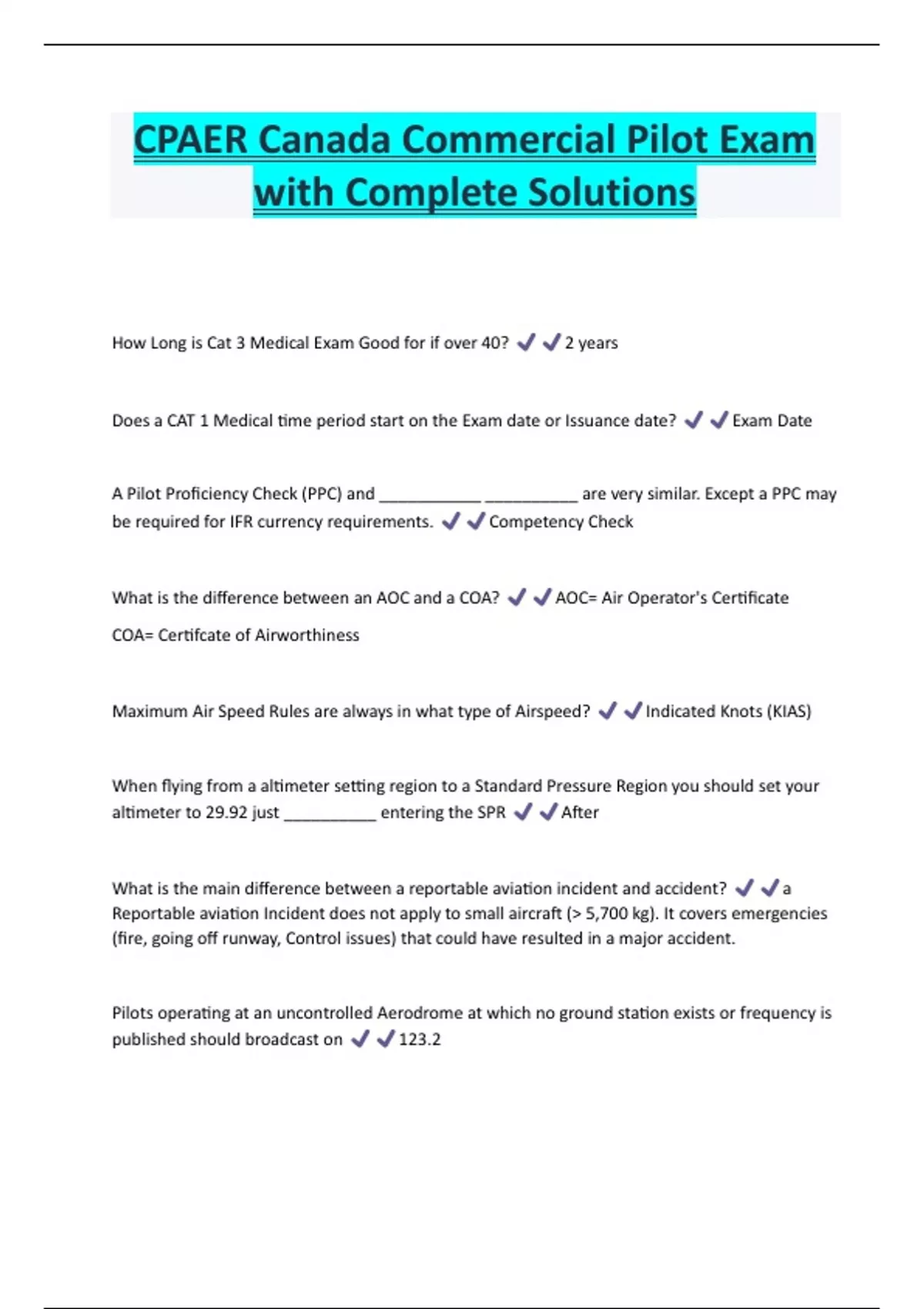 CPAER Canada Commercial Pilot Exam with Complete Solutions How Long is Cat 3 Medical Exam Good for if over 40? 2 years Does a CAT 1 Medical time period start on the Exam date or Issuance date? Exam Date A Pilot Proficiency Check (PPC) and ___________ __________ are very similar. Except a PPC may be required for IFR currency requirements. Competency Check What is the difference between an AOC and a COA? AOC= Air Operator's Certificate COA= Certifcate of Airworthiness Maximum Air Speed Rules are always in what type of Airspeed? Indicated Knots (KIAS) When flying from a altimeter setting region to a Standard Pressure Region you should set your altimeter to 29.92 just __________ entering the SPR After