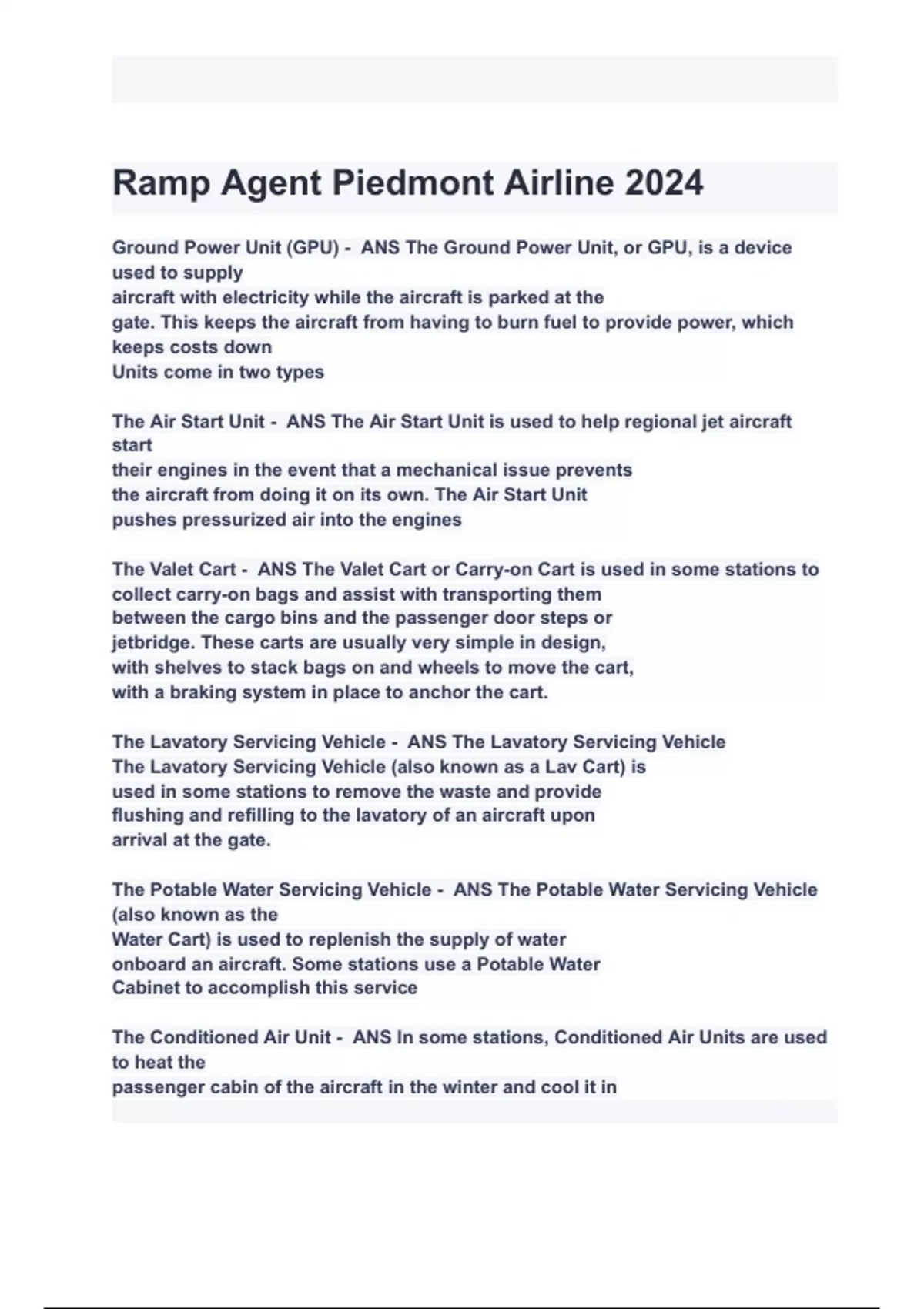 Ramp Agent Piedmont Airline 2024 Questions with correct Answers Already Passed.