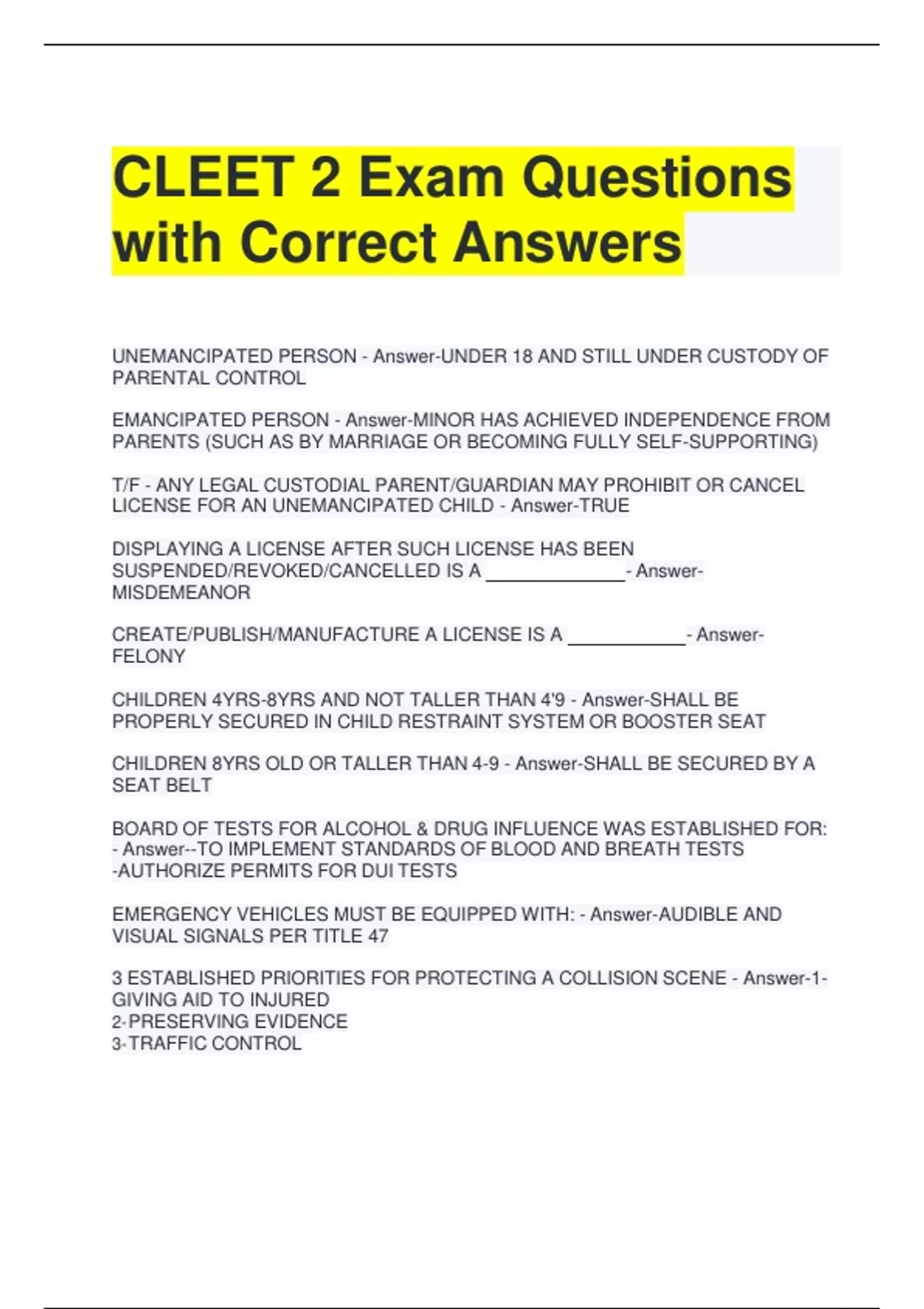 CLEET 2 Exam Questions with Correct Answers PATROL CAR POSITION FOR A TRAFFIC STOP - Answer-30FT BACK, AT A 30 DEGREE ANGLE TO THE RIGHT, WHEELS TURNED TO THE LEFT MOST DANGEROUS TIME OF A TRAFFIC STOP - Answer-INITIAL APPROACH APPROACHING A STOPPED VEHICLE - Answer-TAKE A 45 DEGREE ANGLE POSITION BEHIND DRIVERS SIDE DOORPOST GUN SIDE AWAY STAYING CLEAR OF DRIVERS DOOR (ALLOW) OR (DO NOT ALLOW) PASSENGERS TO EXIT VEHICLE - Answer-DO NOT ALLOW BEFORE BEING JAILED: ANY PERSON INJURED - Answer-MUST BE EXAMINED BY A PHYSICIAN AND GIVEN FIRST AID TO JAIL AN UNCONSCIOUS PERSON - Answer-THEY MUST BE EXAMINED BY A PHYSICIAN FIRST PRIOR TO TRANSPORTING A PRISONER - Answer-SEARCH THE PRISONER YOURSELF // ALWAYS PERFORM YOUR OWN SEARCH EXCEPTION FOR ALWAYS CUFFING HANDS BEHIND THE BACK - Answer-WHEN CUFFS ARE USED WITH A BELLY CHAIN STRIP/SKIN SEARCH IS - Answer-IS VISUAL ONLY, AND IS PERFORMED IN A JAIL BUILDING SEARCH - BY EMPLOYING PROPER TACTICS, DEADLY FORCE CAN MANY TIMES BE - Answer-AVOIDED MOST HAZARDOUS PART OF BUILDING SEARCH - Answer-INITIAL APPROACH FATAL FUNNEL - Answer-DOORWAY/HALLWAY/ENTRY POINT (LIMITED ACCESS TO SUSPECT AND ALMOST COMPLETE EXPOSURE OF OFFICER) DYNAMIC ENTRY - Answer-FAST, POWERFUL ENTRY USING SPEED TO CLEAR THE FATAL FUNNEL LIMITED ENTRY - Answer-SLOW, QUIET, METHODICAL SEARCH USING COVER TO PROVIDE SAFETY EDO - Answer-(EMERGENCY DETENTION ORDER) MAXIMUM CONFINEMENT TIME OF 120HRS, EXCLUDING HOLIDAYS/WEEKENDS SIX FUNDAMENTALS OF HANDGUN - Answer-1- PROPER STANCE 2- PROPER GRIP 3- SIGHT ALIGNMENT 4- BREATH CONTROL 5- TRIGGER CONTROL 6- FOLLOW-THRU (MAINTAIN STATUS QUO) TRANSFERRING A SEMI AUTO TO ANOTHER PERSON - Answer-SAFETY ON (DE- COCKED IF APPLICABLE) REMOVE MAGAZINE, OPEN CHAMBER BY PUSHING SLIDE TO THE REAR AND LOCKING SLIDE TO THE REAR, ONCE CONFIRMED EMPTY, PRESENT FIREARM GRIP FIRST MUZZLE TO THE GROUND FIRE ARM PRIMARY SAFETY - Answer-YOUR INDEX FINGER (TRIGGER FINGER) DISTANCE FOR INTERVIEWS - Answer-4-6 FT DISTANCE FOR MISDEMEANOR ARREST - Answer-8-10 FT