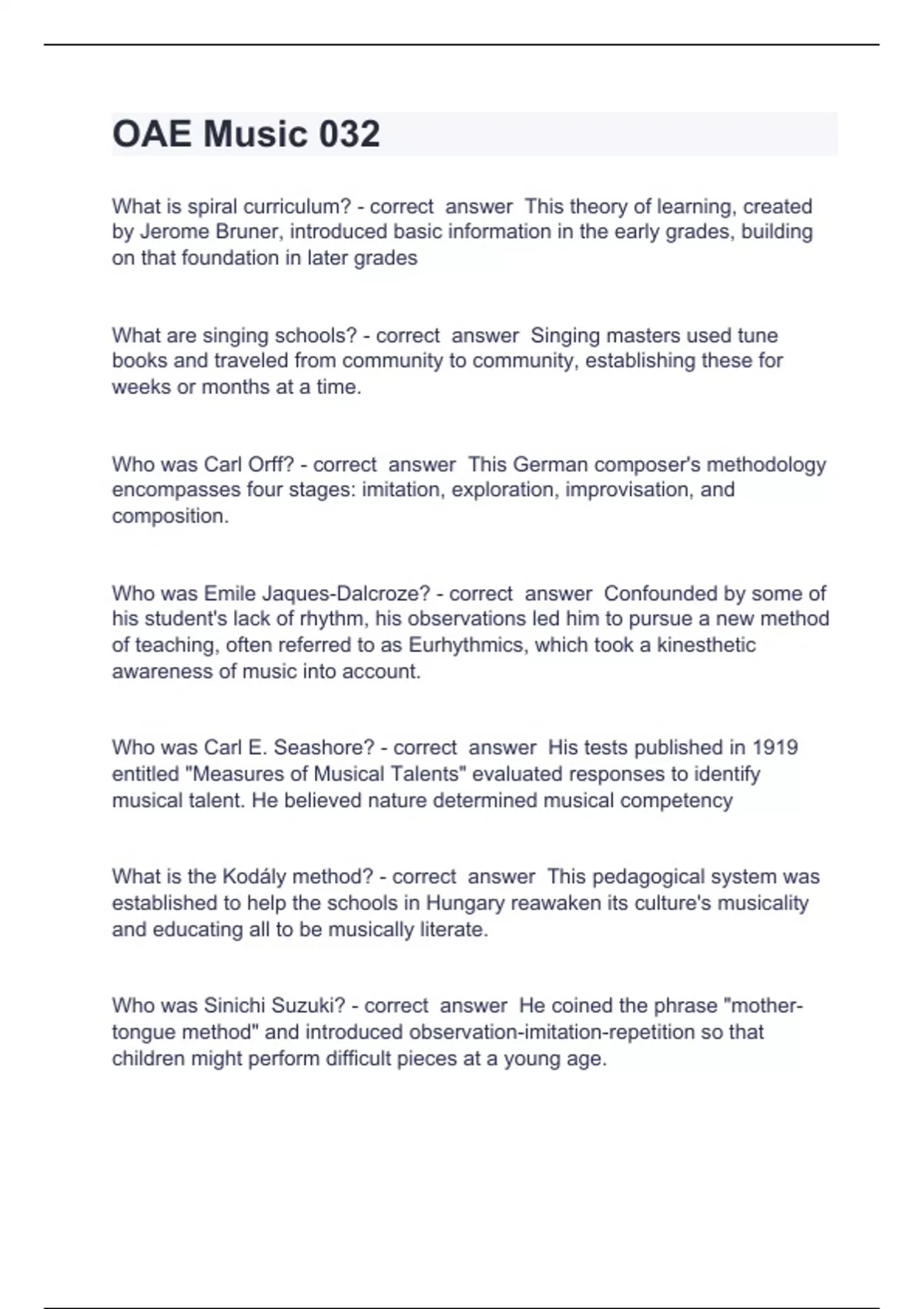 OAE Music 032 Question and answers correctly solved OAE Music 032 What is spiral curriculum? - correct answer This theory of learning, created by Jerome Bruner, introduced basic information in the early grades, building on that foundation in later grades What are singing schools? - correct answer Singing masters used tune books and traveled from community to community, establishing these for weeks or months at a time. Who was Carl Orff? - correct answer This German composer's methodology encompasses four stages: imitation, exploration, improvisation, and composition. Who was Emile Jaques-Dalcroze? - correct answer Confounded by some of his student's lack of rhythm, his observations led him to pursue a new method of teaching, often referred to as Eurhythmics, which took a kinesthetic awareness of music into account. Who was Carl E. Seashore? - correct answer His tests published in 1919 entitled "Measures of Musical Talents" evaluated responses to identify musical talent. He believed nature determined musical competency What is the Kodály method? - correct answer This pedagogical system was established to help the schools in Hungary reawaken its culture's musicality and educating all to be musically literate. Who was Sinichi Suzuki? - correct answer He coined the phrase "mother-tongue method" and introduced observation-imitation-repetition so that children might perform difficult pieces at a young age.