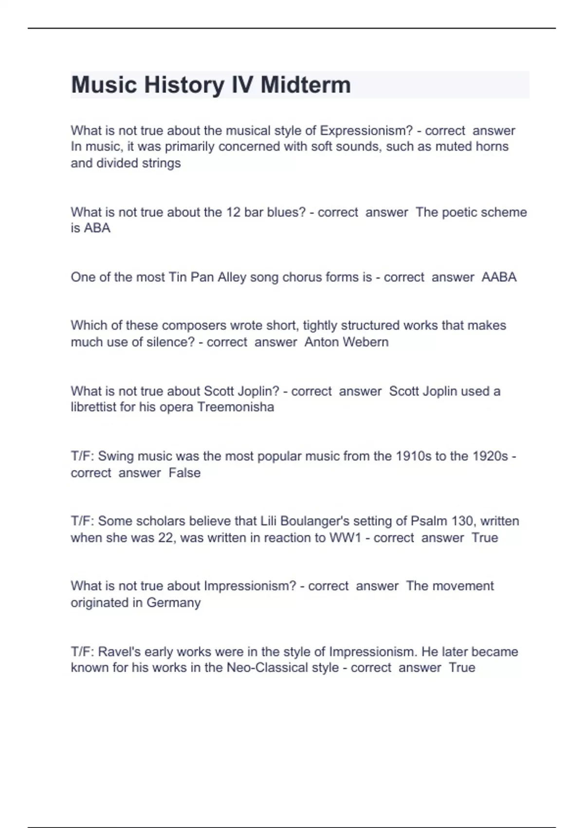Music History IV Midterm Question and answers already passed Music History IV Midterm What is not true about the musical style of Expressionism? - correct answer In music, it was primarily concerned with soft sounds, such as muted horns and divided strings What is not true about the 12 bar blues? - correct answer The poetic scheme is ABA One of the most Tin Pan Alley song chorus forms is - correct answer AABA