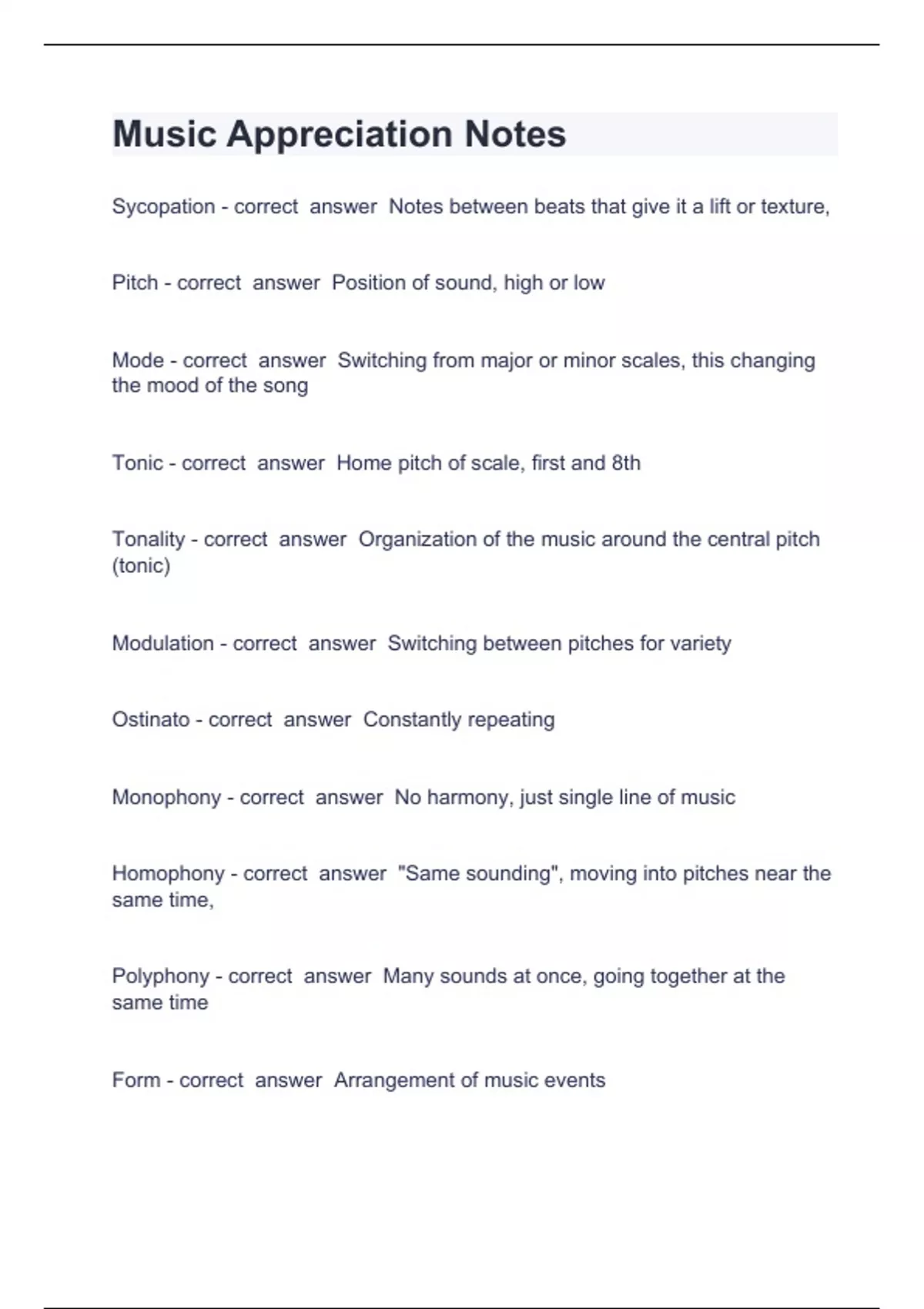 Music Appreciation Notes Question and answers 100% correct Music Appreciation Notes Sycopation - correct answer Notes between beats that give it a lift or texture, Pitch - correct answer Position of sound, high or low Mode - correct answer Switching from major or minor scales, this changing the mood of the song Tonic - correct answer Home pitch of scale, first and 8th Tonality - correct answer Organization of the music around the central pitch (tonic) Modulation - correct answer Switching between pitches for variety Ostinato - correct answer Constantly repeating