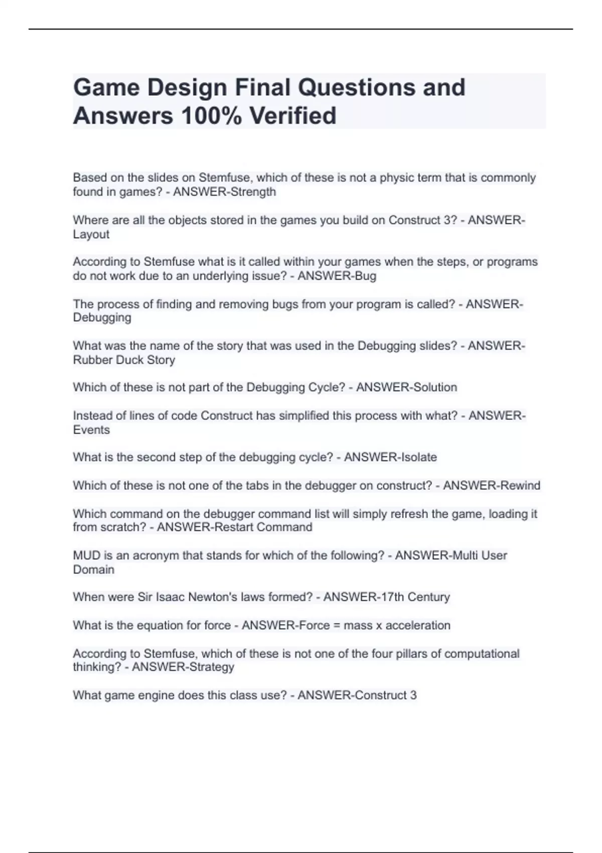 Game Design Final Questions and Answers 100% VerifiedGame Design Final Questions and Answers 100% VerifiedGame Design Final Questions and Answers 100% VerifiedGame Design Final Questions and Answers 100% VerifiedGame Design Final Questions and Answers 100% Verified Based on the slides on Stemfuse, which of these is not a physic term that is commonly found in games? - ANSWER-Strength Where are all the objects stored in the games you build on Construct 3? - ANSWER-Layout According to Stemfuse what is it called within your games when the steps, or programs do not work due to an underlying issue? - ANSWER-Bug