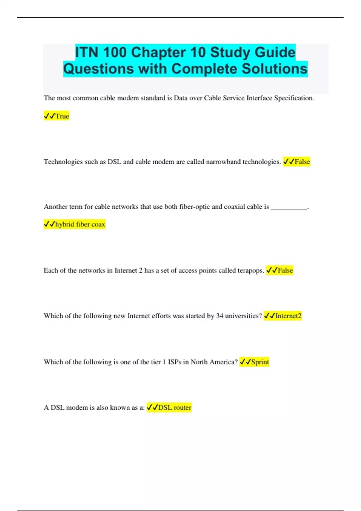 ITN 100 Chapter 10 Study Guide Questions with Complete Solutions The most common cable modem standard is Data over Cable Service Interface Specification. True Technologies such as DSL and cable modem are called narrowband technologies. False Another term for cable networks that use both fiber-optic and coaxial cable is __________. hybrid fiber coax Each of the networks in Internet 2 has a set of access points called terapops. False Which of the following new Internet efforts was started by 34 universities? Internet2 Which of the following is one of the tier 1 ISPs in North America? Sprint A DSL modem is also known as a: DSL router A digital service offered by cable companies is the _________. cable modem At the DSL customer premises is a device called a(n) DSL modem A high-speed Internet has a set of access points called ____pops that provide point-of-presence at ________ speeds. giga, gigabit The most common type of DSL today is ADSL. True At the top of the Internet structure are tier 1 ___________, such as AT&T and Sprint. Internet service providers IXPs were originally designed to connect only tier 3 ISPs. False WiMAX was designed to use the _______ frequencies. 2.3 GHz, 2.5 GHz, and 3.5 GHZ A(n) ___________ contains a series of cable modems/multiplexers and converts the data from cable modem protocols into protocols needed for Internet traffic, before passing them to a router connected to an ISP POP. cable modem termination system A _________ is the place at which the ISP provides