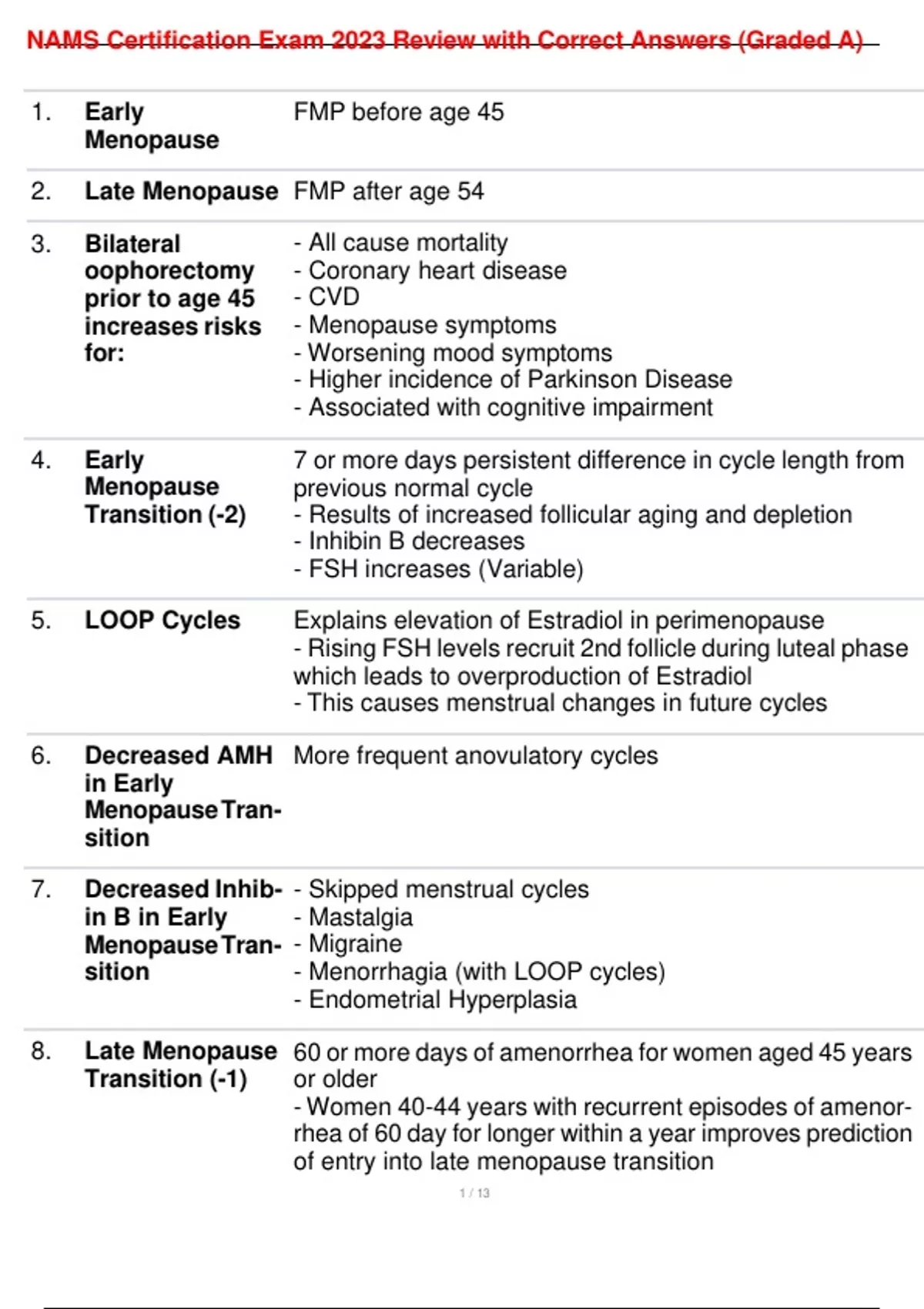NAMS Certification Exam 2023 Review with Correct Answers (Graded A) 1 / 13 1. Early Menopause FMP before age 45 2. Late Menopause FMP after age 54 3. Bilateral oophorectomy prior to age 45 increases risks for: 4. Early Menopause Transition (-2) - All cause mortality - Coronary heart disease - CVD - Menopause symptoms - Worsening mood symptoms - Higher incidence of Parkinson Disease - Associated with cognitive impairment 7 or more days persistent difference in cycle length from previous normal cycle - Results of increased follicular aging and depletion - Inhibin B decreases - FSH increases (Variable) 5. LOOP Cycles Explains elevation of Estradiol in perimenopause - Rising FSH levels recruit 2nd follicle during luteal phase which leads to overproduction of Estradiol - This causes menstrual changes in future cycles 6. Decreased AMH in Early MenopauseTransition 7. Decreased Inhibin B in Early MenopauseTransition 8. Late Menopause Transition (-1) More frequent anovulatory cycles - Skipped menstrual cycles - Mastalgia - Migraine - Menorrhagia (with LOOP cycles) - Endometrial Hyperplasia 60 or more days of amenorrhea for women aged 45 years or older - Women 40-44 years with recurrent episodes of amenorrhea of 60 day for longer within a year improves prediction of entry into late menopause transition