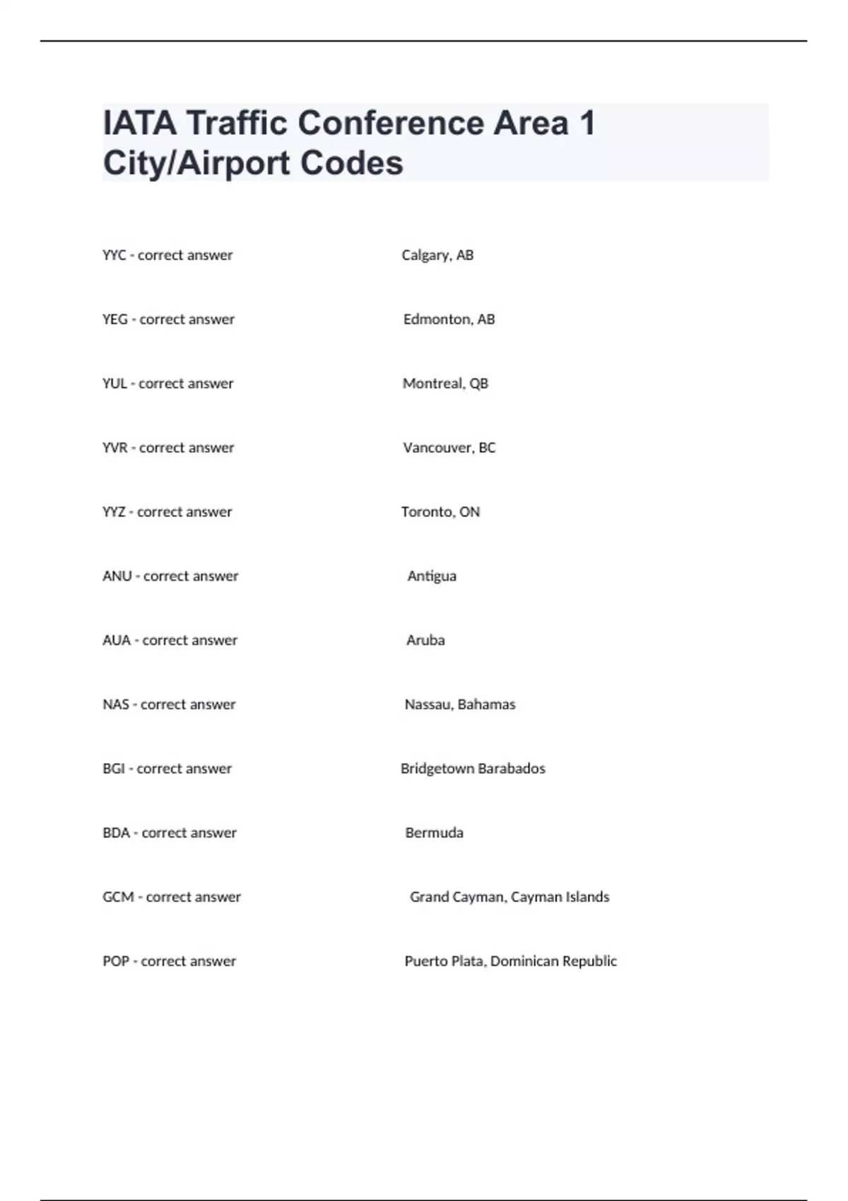 IATA Traffic Conference Area 1 City/Airport Codes Practice Questions And Answers.