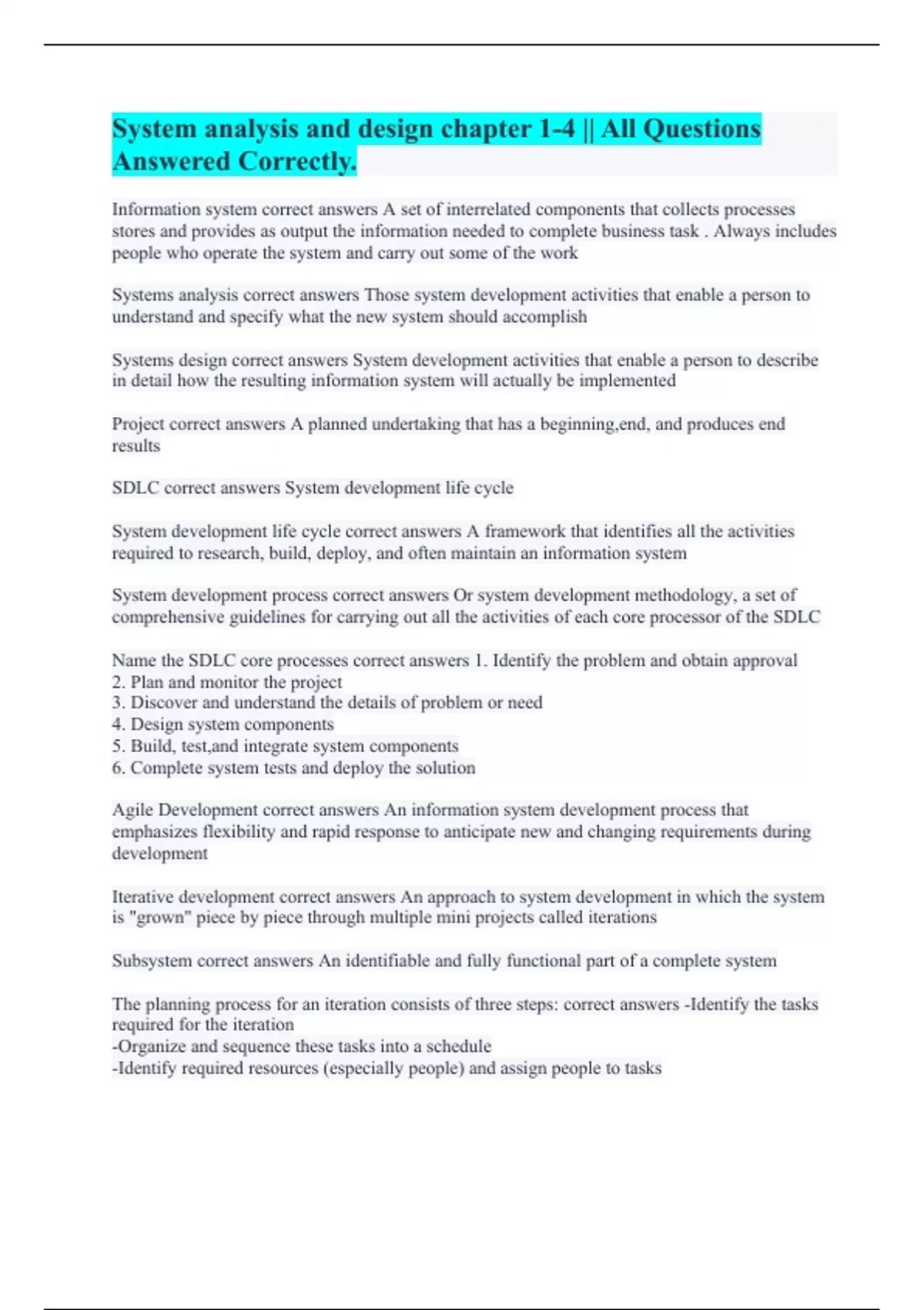 Information system correct answers A set of interrelated components that collects processes stores and provides as output the information needed to complete business task . Always includes people who operate the system and carry out some of the work Systems analysis correct answers Those system development activities that enable a person to understand and specify what the new system should accomplish Systems design correct answers System development activities that enable a person to describe in detail how the resulting information system will actually be implemented Project correct answers A planned undertaking that has a beginning,end, and produces end results SDLC correct answers System development life cycle System development life cycle correct answers A framework that identifies all the activities required to research, build, deploy, and often maintain an information system System development process correct answers Or system development methodology, a set of comprehensive guidelines for carrying out all the activities of each core processor of the SDLC Name the SDLC core processes correct answers 1. Identify the problem and obtain approval 2. Plan and monitor the project 3. Discover and understand the details of problem or need 4. Design system components 5. Build, test,and integrate system components 6. Complete system tests and deploy the solution Agile Development correct answers An information system development process that emphasizes flexibility and rapid response to anticipate new and changing requirements during development Iterative development correct answers An approach to system development in which the system is "grown" piece by piece through multiple mini projects called iterations Subsystem correct answers An identifiable and fully functional part of a complete system The planning process for an iteration consists of three steps: correct answers -Identify the tasks required for the iteration -Organize and sequence these tasks into a schedule -Identify required resources (especially people) and assign people to tasks
