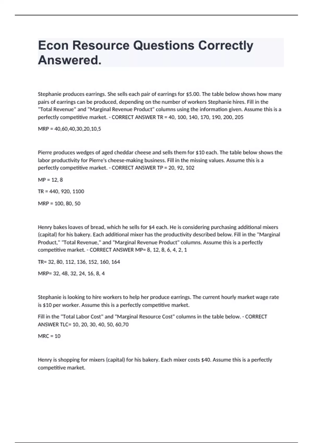 Econ Resource Questions Correctly Answered. Stephanie produces earrings. She sells each pair of earrings for $5.00. The table below shows how many pairs of earrings can be produced, depending on the number of workers Stephanie hires. Fill in the "Total Revenue" and "Marginal Revenue Product" columns using the information given. Assume this is a perfectly competitive market. - CORRECT ANSWER TR = 40, 100, 140, 170, 190, 200, 205 MRP = 40,60,40,30,20,10,5 Pierre produces wedges of aged cheddar cheese and sells them for $10 each. The table below shows the labor productivity for Pierre's cheese-making business. Fill in the missing values. Assume this is a perfectly competitive market. - CORRECT ANSWER TP = 20, 92, 102 MP = 12, 8 TR = 440, 920, 1100 MRP = 100, 80, 50 Henry bakes loaves of bread, which he sells for $4 each. He is considering purchasing additional mixers (capital) for his bakery. Each additional mixer has the productivity described below. Fill in the "Marginal Product," "Total Revenue," and "Marginal Revenue Product" columns. Assume this is a perfectly competitive market. - CORRECT ANSWER MP= 8, 12, 8, 6, 4, 2, 1 TR= 32, 80, 112, 136, 152, 160, 164 MRP= 32, 48, 32, 24, 16, 8, 4 Stephanie is looking to hire workers to help her produce earrings. The current hourly market wage rate is $10 per worker. Assume this is a perfectly competitive market. Fill in the "Total Labor Cost" and "Marginal Resource Cost" columns in the table below. - CORRECT ANSWER TLC= 10, 20, 30, 40, 50, 60,70 MRC = 10 Henry is shopping for mixers (capital) for his bakery. Each mixer costs $40. Assume this is a perfectly competitive market.