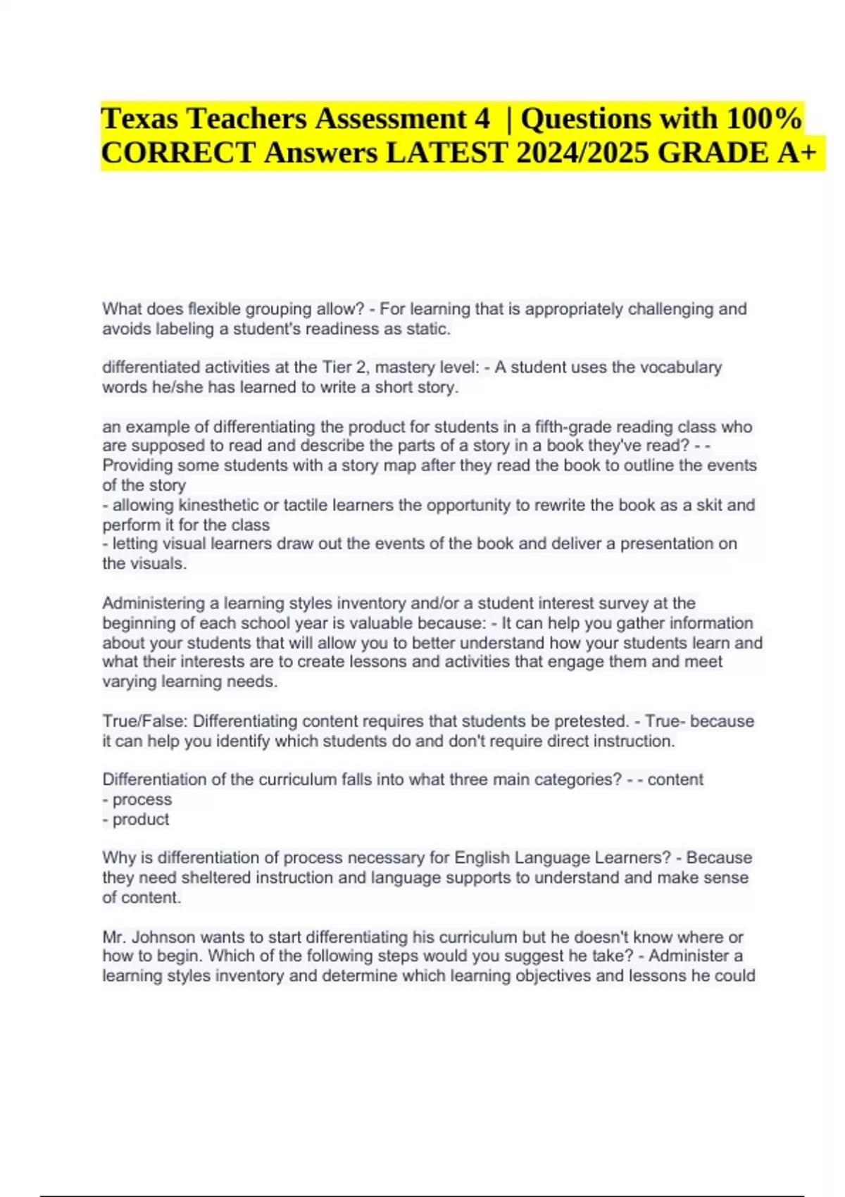 Texas Teachers Assessment 4 | Questions with 100% CORRECT Answers LATEST 2024/2025 GRADE A+. What does flexible grouping allow? - For learning that is appropriately challenging and avoids labeling a student's readiness as static. differentiated activities at the Tier 2, mastery level: - A student uses the vocabulary words he/she has learned to write a short story. an example of differentiating the product for students in a fifth-grade reading class who are supposed to read and describe the parts of a story in a book they've read? - - Providing some students with a story map after they read the book to outline the events of the story - allowing kinesthetic or tactile learners the opportunity to rewrite the book as a skit and perform it for the class - letting visual learners draw out the events of the book and deliver a presentation on the visuals. Administering a learning styles inventory and/or a student interest survey at the beginning of each school year is valuable because: - It can help you gather information about your students that will allow you to better understand how your students learn and what their interests are to create lessons and activities that engage them and meet varying learning needs. True/False: Differentiating content requires that students be pretested. - True- because it can help you identify which students do and don't require direct instruction. Differentiation of the curriculum falls into what three main categories? - - content - process - product Why is differentiation of process necessary for English Language Learners? - Because they need sheltered instruction and language supports to understand and make sense of content. Mr. Johnson wants to start differentiating his curriculum but he doesn't know where or how to begin. Which of the following steps would you suggest he take? - Administer a learning styles inventory and determine which learning objectives and lessons he could Texas Teachers Assessment 4 | Questions with 100% CORRECT Answers LATEST 2024/2025 GRADE A+ adapt or revise to begin incorporating student's learning styles in his content delivery, classroom activities, and assessments. Identify the four factors you should consider when planning differentiated lessons? - - student readiness to learn - student background - student learning style - student interest. scenarios, the teacher differentiating the learning environment: - Ms. Gonzalez, a fifthgrade reading teacher has a variety of reading "nooks" in the room. During silent reading time, some students sit in bean bag chairs, others on the floor with blankets and pillows, some in desks and a few outside in the hallway right outside her room. When using technology in the classroom, what should teachers consider first before using it? - Curricular learning objectives. How does blended learning meet the diverse needs of students in a classroom? - Because it allows students the opportunity to control the time, pace, path, and pace of their learning so they can be engaged both in and out of the classroom. What is the main purpose for understanding and using the ISTE Standards for Teachers, Students, Coaches and Administrators? - Allows for the successful implementation of digital strategies that impact learning, teaching, and working in a digital world. an example of how to teach/incorporate digital citizenship into the classroom - - A health teacher discusses the psychological and emotional impact of cyber bullying by showing students examples of online harassment and bullying on websites like Twitter and Facebook. - A science teacher wants students to engage in an online discussion forum throughout the school year so she distributes a list of acceptable online communication expectations and behaviors for students to follow when they post their responses and comments. - An English teacher is preparing students for a research paper and takes them to the library to learn about how to properly cite sources and avoid plagiarism. Flipped Learning model - Mr. Jones has created a short six-minute video lecture on Chapter 9 in his History textbook. He asks students to watch his video at home for homework and answer ten questions via an online quiz. When students return to class the next day, they review their quiz answers and clarify misconceptions. Afterwards they engage in group discussions debating chapter 9 topics assigned by Mr. Jones. Identify which of the following tools can help you build your Professional Learning Network: - - Facebook - Twitter - Blogs Mrs. Jacobs wants her students to collaborate, communicate, and submit work online for a group project they need to work on both in and outside of class. Which of the following tools could best help her achieve these goals? - Learning management systems like Edmodo and Schoology. The following scenario is an example of which ISTE Standard for Students? Students in Mrs. Miller's Spanish class are learning conversational Spanish vocabulary and grammar. Mrs. Miller wants students to practice their verbal and written Spanish. She has a colleague in Mexico who has agreed to collaborate with her to pair students in their classrooms to exchange online letters and engage in group discussions once a week via a moderated online chat room. Once a quarter, as a whole class they use a video conferencing program to have relevant discussions on sports, the weather and news events. - Students use digital media and environments to communicate and work collaboratively, including at a distance to support individual learning and contribute to the learning of others. True/False: A teacher wants to incorporate technology into his/her own classroom but is afraid and isn't sure where to begin. A recommendation you could make is to have him/her review their course objectives and decide where technology could be substituted to achieve the same goals. - True because the teacher should always consider the learning objectives first and then start small with a lesson he/she is 