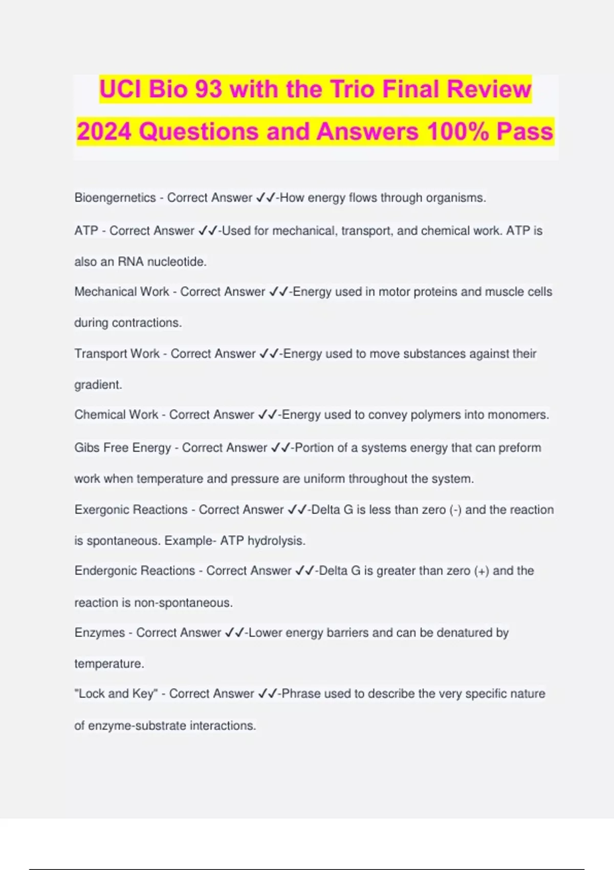 UCI Bio 93 with the Trio Final Review 2024 Questions and Answers 100% Pass Bioengernetics - Correct Answer ️️ -How energy flows through organisms. ATP - Correct Answer ️️ -Used for mechanical, transport, and chemical work. ATP is also an RNA nucleotide. Mechanical Work - Correct Answer ️️ -Energy used in motor proteins and muscle cells during contractions. Transport Work - Correct Answer ️️ -Energy used to move substances against their gradient. Chemical Work - Correct Answer ️️ -Energy used to convey polymers into monomers. Gibs Free Energy - Correct Answer ️️ -Portion of a systems energy that can preform work when temperature and pressure are uniform throughout the system. Exergonic Reactions - Correct Answer ️️ -Delta G is less than zero (-) and the reaction is spontaneous. Example- ATP hydrolysis. Endergonic Reactions - Correct Answer ️️ -Delta G is greater than zero (+) and the reaction is non-spontaneous. Enzymes - Correct Answer ️️ -Lower energy barriers and can be denatured by temperature. "Lock and Key" - Correct Answer ️️ -Phrase used to describe the very specific nature of enzyme-substrate interactions.