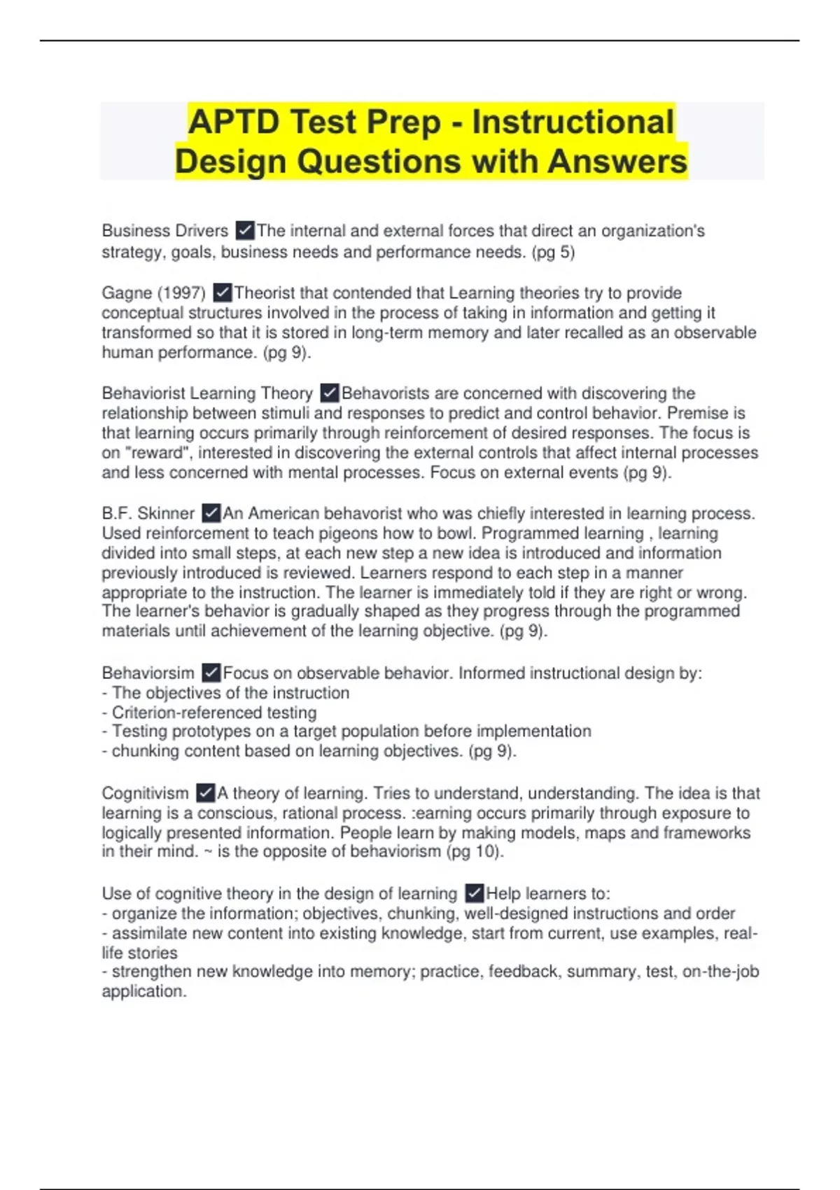 Business Drivers The internal and external forces that direct an organization's strategy, goals, business needs and performance needs. (pg 5) Gagne (1997) Theorist that contended that Learning theories try to provide conceptual structures involved in the process of taking in information and getting it transformed so that it is stored in long-term memory and later recalled as an observable human performance. (pg 9). Behaviorist Learning Theory Behavorists are concerned with discovering the relationship between stimuli and responses to predict and control behavior. Premise is that learning occurs primarily through reinforcement of desired responses. The focus is on "reward", interested in discovering the external controls that affect internal processes and less concerned with mental processes. Focus on external events (pg 9). B.F. Skinner An American behavorist who was chiefly interested in learning process. Used reinforcement to teach pigeons how to bowl. Programmed learning , learning divided into small steps, at each new step a new idea is introduced and information previously introduced is reviewed. Learners respond to each step in a manner appropriate to the instruction. The learner is immediately told if they are right or wrong. The learner's behavior is gradually shaped as they progress through the programmed materials until achievement of the learning objective. (pg 9). Behaviorsim Focus on observable behavior. Informed instructional design by: - The objectives of the instruction - Criterion-referenced testing - Testing prototypes on a target population before implementation - chunking content based on learning objectives. (pg 9). Cognitivism A theory of learning. Tries to understand, understanding. The idea is that learning is a conscious, rational process. :earning occurs primarily through exposure to logically presented information. People learn by making models, maps and frameworks in their mind. ~ is the opposite of behaviorism (pg 10). Use of cognitive theory in the design of learning Help learners to: - organize the information; objectives, chunking, well-designed instructions and order - assimilate new content into existing knowledge, start from current, use examples, real-life stories - strengthen new knowledge into memory; practice, feedback, summary, test, on-the-job application.