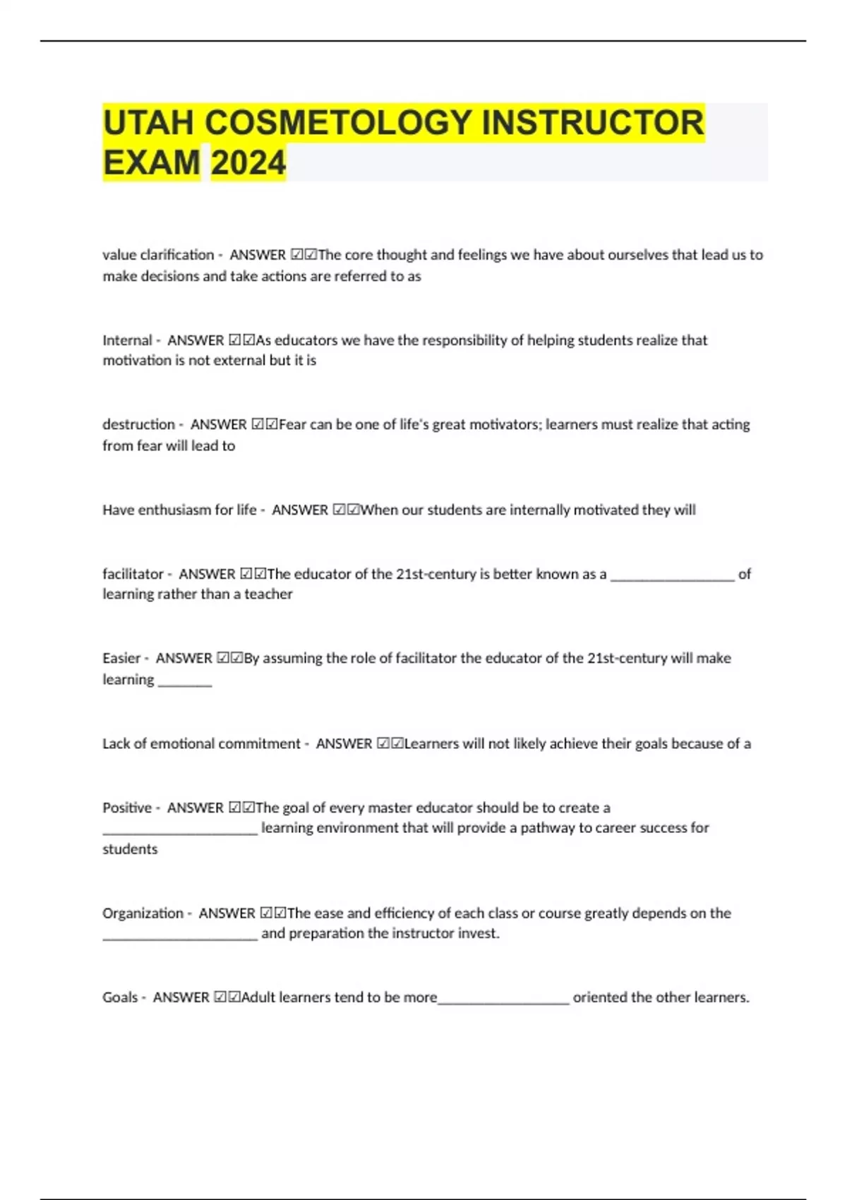 value clarification - ANSWER ☑☑The core thought and feelings we have about ourselves that lead us to make decisions and take actions are referred to as Internal - ANSWER ☑☑As educators we have the responsibility of helping students realize that motivation is not external but it is destruction - ANSWER ☑☑Fear can be one of life's great motivators; learners must realize that acting from fear will lead to Have enthusiasm for life - ANSWER ☑☑When our students are internally motivated they will facilitator - ANSWER ☑☑The educator of the 21st-century is better known as a ________________ of learning rather than a teacher Easier - ANSWER ☑☑By assuming the role of facilitator the educator of the 21st-century will make learning _______ Lack of emotional commitment - ANSWER ☑☑Learners will not likely achieve their goals because of a