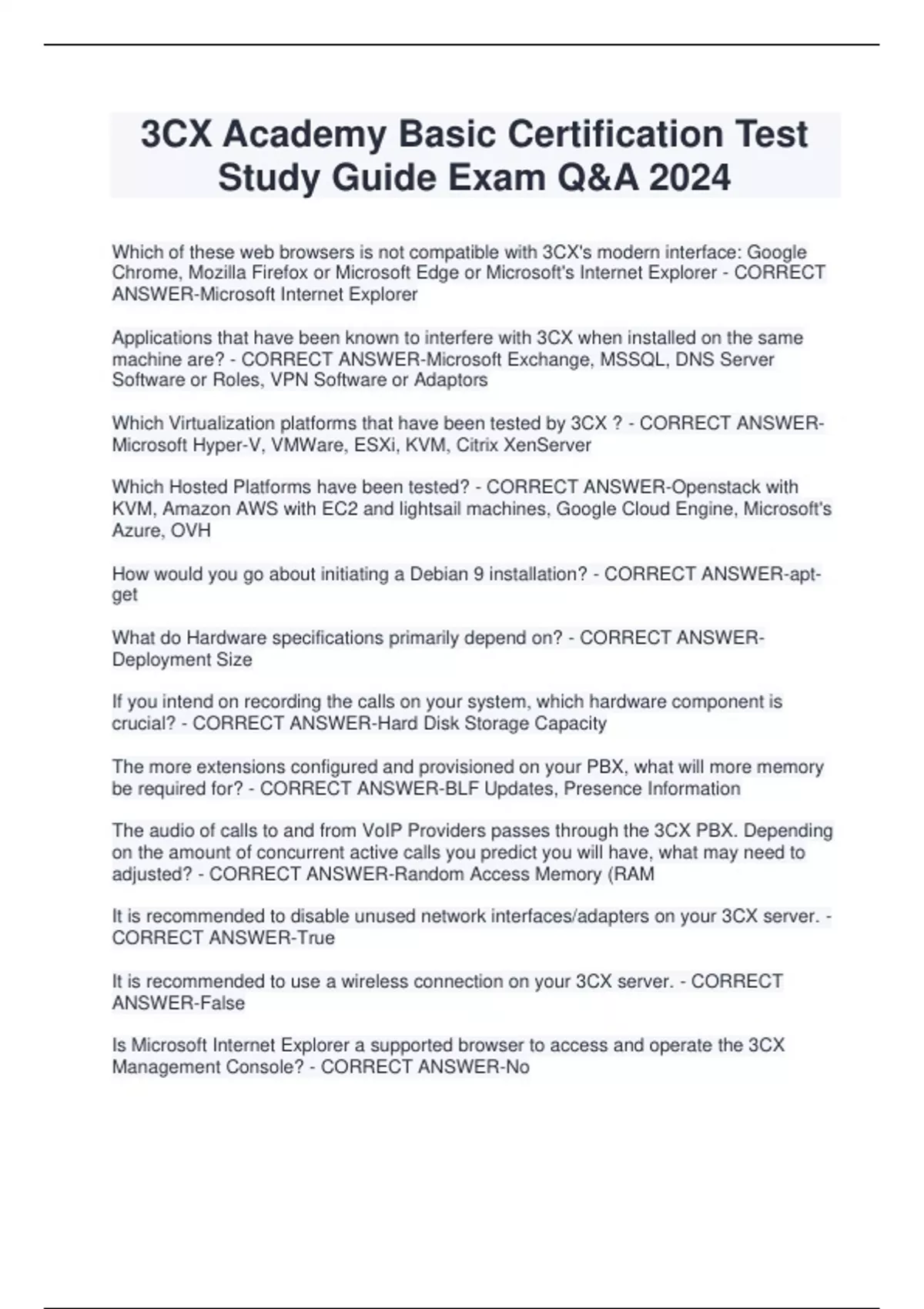 3CX Academy Basic Certification Test Study Guide Exam Q&A 2024 Which of these web browsers is not compatible with 3CX's modern interface: Google Chrome, Mozilla Firefox or Microsoft Edge or Microsoft's Internet Explorer - CORRECT ANSWER-Microsoft Internet Explorer Applications that have been known to interfere with 3CX when installed on the same machine are? - CORRECT ANSWER-Microsoft Exchange, MSSQL, DNS Server Software or Roles, VPN Software or Adaptors Which Virtualization platforms that have been tested by 3CX ? - CORRECT ANSWERMicrosoft Hyper-V, VMWare, ESXi, KVM, Citrix XenServer Which Hosted Platforms have been tested? - CORRECT ANSWER-Openstack with KVM, Amazon AWS with EC2 and lightsail machines, Google Cloud Engine, Microsoft's Azure, OVH How would you go about initiating a Debian 9 installation? - CORRECT ANSWER-aptget What do Hardware specifications primarily depend on? - CORRECT ANSWERDeployment Size
