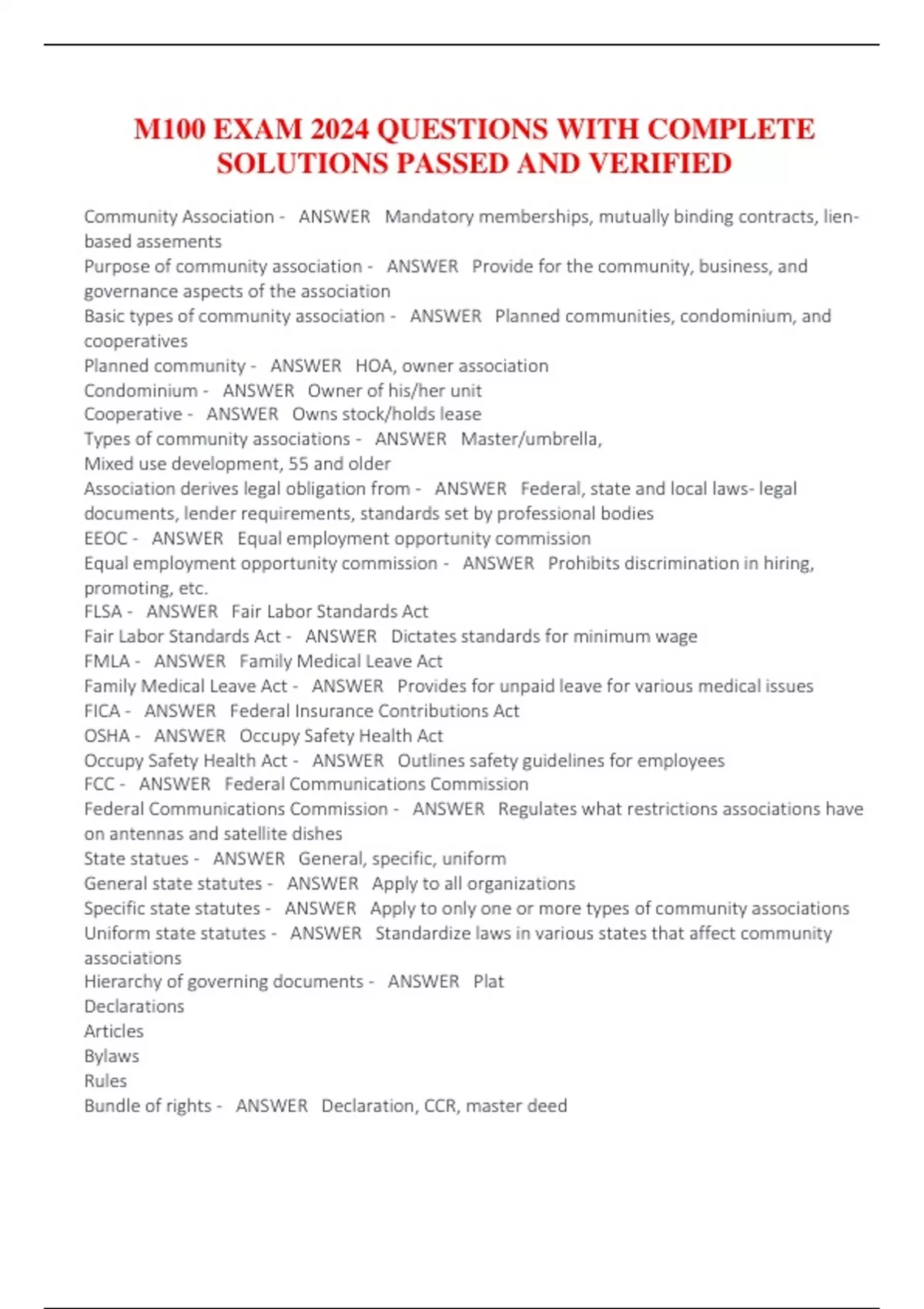 M100 EXAM 2024 QUESTIONS WITH COMPLETE SOLUTIONS PASSED AND VERIFIED Community Association - ANSWER Mandatory memberships, mutually binding contracts, lien-based assements Purpose of community association - ANSWER Provide for the community, business, and governance aspects of the association Basic types of community association - ANSWER Planned communities, condominium, and cooperatives Planned community - ANSWER HOA, owner association Condominium - ANSWER Owner of his/her unit Cooperative - ANSWER Owns stock/holds lease Types of community associations - ANSWER Master/umbrella, Mixed use development, 55 and older Association derives legal obligation from - ANSWER Federal, state and local laws- legal documents, lender requirements, standards set by professional bodies EEOC - ANSWER Equal employment opportunity commission Equal employment opportunity commission - ANSWER Prohibits discrimination in hiring, promoting, etc.