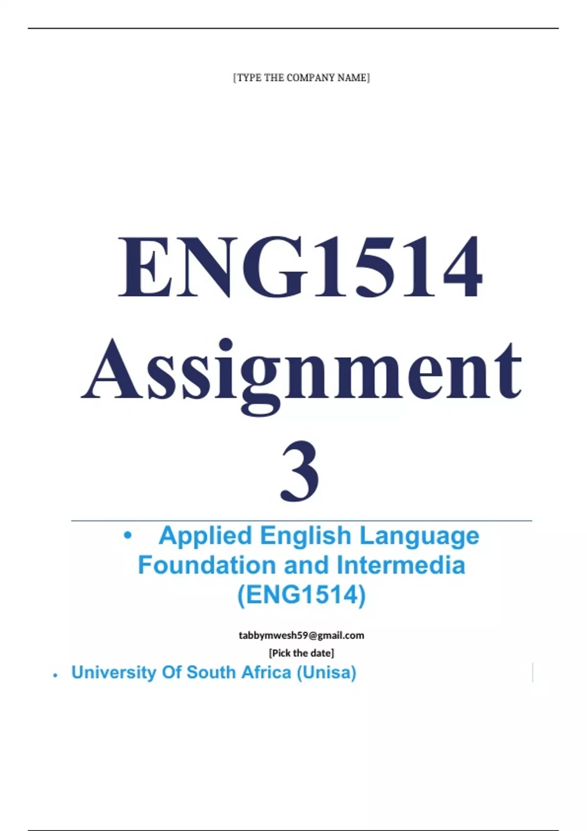 Exam (elaborations) ENG1514 Assignment 3 (COMPLETE ANSWERS) 2024 (832090) - 5 August 2024 • Course • Applied English Language Foundation and Intermedia (ENG1514) • Institution • University Of South Africa (Unisa) • Book • English as an Additional Language