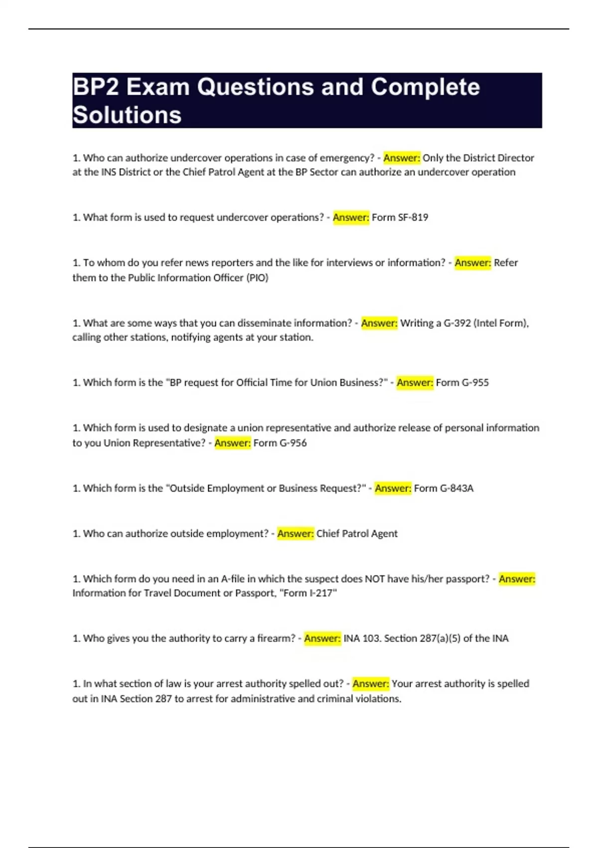 BP2 Exam Questions and Complete Solutions 1. Who can authorize undercover operations in case of emergency? - Answer: Only the District Director at the INS District or the Chief Patrol Agent at the BP Sector can authorize an undercover operation 1. What form is used to request undercover operations? - Answer: Form SF-819 1. To whom do you refer news reporters and the like for interviews or information? - Answer: Refer them to the Public Information Officer (PIO) 1. What are some ways that you can disseminate information? - Answer: Writing a G-392 (Intel Form), calling other stations, notifying agents at your station. 1. Which form is the "BP request for Official Time for Union Business?" - Answer: Form G-955 1. Which form is used to designate a union representative and authorize release of personal information to you Union Representative? - Answer: Form G-956 1. Which form is the "Outside Employment or Business Request?" - Answer: Form G-843A 1. Who can authorize outside employment? - Answer: Chief Patrol Agent 1. Which form do you need in an A-file in which the suspect does NOT have his/her passport? - Answer: Information for Travel Document or Passport, "Form I-217" 1. Who gives you the authority to carry a firearm? - Answer: INA 103. Section 287(a)(5) of the INA 1. In what section of law is your arrest authority spelled out? - Answer: Your arrest authority is spelled out in INA Section 287 to arrest for administrative and criminal violations. 1. Agent X is involved in a shooting. Within what time frame must he report it to his supervisor? - Answer: 1 hr 1. After Agent X's shooting incident, how long does a supervisor have to report it to his supervisors? - Answer: 1 hr 1. What is the section number for Firearms Policy Administrative Manual? - Answer: AM 20.012, Firearms Policy 1. Can you prosecute a USC for High Speed Flight from an Immigration Checkpoint and if so, is it a misdemeanor or a felony offense? - Answer: Yes, it is a felony. 1. Within what time frame must vehicle pursuit reports be made? - Answer: Pursuing agent by the end of shift must make a vehicle pursuit report. Sector must contact HQs in DC within 72 hrs. 1. If the local law enforcement organization calls you and tells you that they know of several illegal aliens present in a hotel, what should you do? - Answer: Obtain a "Blackie's" warrant. 1. Which of the following is the Chain of Custody Form? - Answer: Chain of Custody Form I-641 1. What is an I-641A? - Answer: Evidence Label. 1. What is the minimum amount of time must a supervisors give an employee before a change in the daily schedule? - Answer: Supervisors must give a 24-hour minimum advance notice before changing the daily schedule. 1. Which of the following forms is the "Notice of Custody Determination" in an A-file? - Answer: Notice of Custody Determination. I-286 1. To cancel a Border Crosser Card (BCC), which form would you use? - Answer: I-275 1. Which of the following forms is the "Warrant of Removal or Deportation?' - Answer: I-205 1. To check the mileage on any given service vehicle at any time, which form would you check? - Answer: G-205 1. Which of the following forms is the Vehicle Inventory Fleet Report used at the end of the month? - Answer: G-205A 1. Which of the following forms is included in a seized vehicle packet? - Answer: I-43, Receipt of Property Seized 1. What is the G-259? - Answer: Bi-weekly form used to schedule agent's workdays 1. How many days minimum prior to the start of next pay period must the bi-weekly schedule be posted? - Answer: At least 5 days prior 1. If there are any witnesses to the above-mentioned accident, which form should you give the witnesses? - Answer: SF-94 1. Which form is used to file general complaints and is called Report of Complaint? - Answer: I-847 1. To take a sworn statement from a subject, which forms would you use? - Answer: I-215 1. What level of suspicion is a K9 alert at a USBP checkpoint? - Answer: PROBABLE CAUSE 1. You have an l0-45, the driver and five aliens. None of them are the registered owner of the vehicle. But the driver states that he knew the aliens he was transporting were in the United States illegally. Can you seize the vehicle? - Answer: No, you need knowledge by the owner of the vehicle that the aliens being transported were illegally in the US. 1. What is an SF-1187? - Answer: Request for Payroll Deductions Dues 1. What is an SF-1188? - Answer: Cancellation of Payroll Deductions Dues 1. You are a Supervisor in the processing room, there's an injured alien that does not want to file a complaint. What do you do? - Answer: Give medical help and document the incident 1. Where do you find the authority to board a vessel one mile off the coast of the Florida Peninsula? - Answer: INA 287, To board and search within a reasonable distance (100 miles) from the border 1. To justify the use of deadly force, as per AM 20.012 (Firearms Policy), what 3 elements are needed? - Answer: The 3 elements must be present: MEANS, INTENT and OPPORTUNITY. 1. Agent X gets arrested for domestic violence. What policy has he violated? - Answer: Has violated the Firearms Policy, AM 20.012 1. Does an I-44 need to be included in a seizure packet? - Answer: NO 1. What is an I-286 form? - Answer: Notice of Custody Determination 1. What is an I-826 form? - Answer: Notice of Rights and Request for Disposition 1. What is an I-770 form? - Answer: Notice of Rights and Reques for Dispo for Juvys 1. What is the administrative manual number of the pursuit policy? - Answer: AM 4214.01. 1. You are at a checkpoint and you are interviewing a young man. He says that he is a student and shows you his F-1 and a valid I-20AB. One what systems do you check his information on? - Answer: CIS, NAILS, CLAIMS, SEVIS, TECS, or Non-Immigrant System Student Visa 1. Who can authorize this individual to work and what documents must he have? - Answer: An F-l student can only work part time w/permission from Designated School Official of the Sch