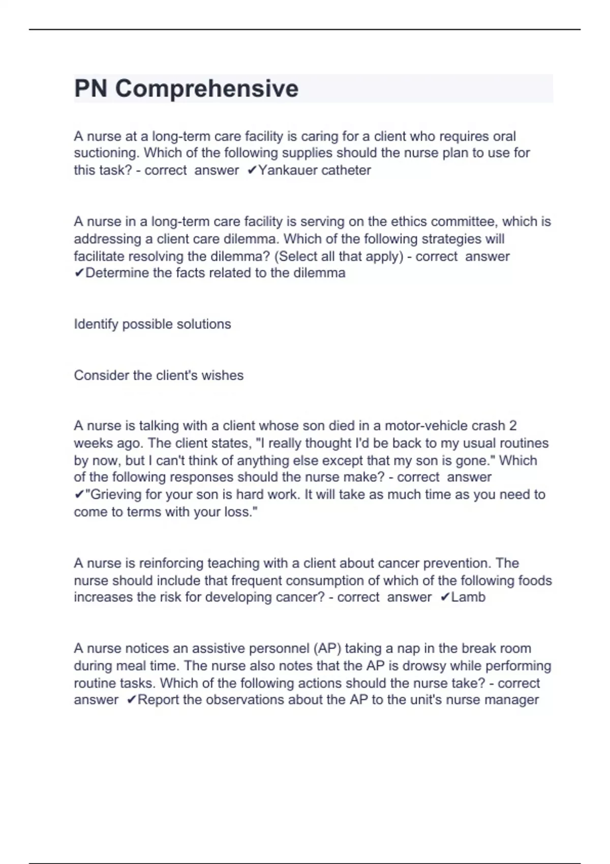 PN Comprehensive PN Management Fortis College - Question and answers rated A+PN Comprehensive A nurse at a long-term care facility is caring for a client who requires oral suctioning. Which of the following supplies should the nurse plan to use for this task? - correct answer Yankauer catheter A nurse in a long-term care facility is serving on the ethics committee, which is addressing a client care dilemma. Which of the following strategies will facilitate resolving the dilemma? (Select all that apply) - correct answer Determine the facts related to the dilemma Identify possible solutions Consider the client's wishes A nurse is talking with a client whose son died in a motor-vehicle crash 2 weeks ago. The client states, "I really thought I'd be back to my usual routines by now, but I can't think of anything else except that my son is gone." Which of the following responses should the nurse make? - correct answer "Grieving for your son is hard work. It will take as much time as you need to come to terms with your loss." A nurse is reinforcing teaching with a client about cancer prevention. The nurse should include that frequent consumption of which of the following foods increases the risk for developing cancer? - correct answer Lamb A nurse notices an assistive personnel (AP) taking a nap in the break room during meal time. The nurse also notes that the AP is drowsy while performing routine tasks. Which of the following actions should the nurse take? - correct answer Report the observations about the AP to the unit's nurse manager