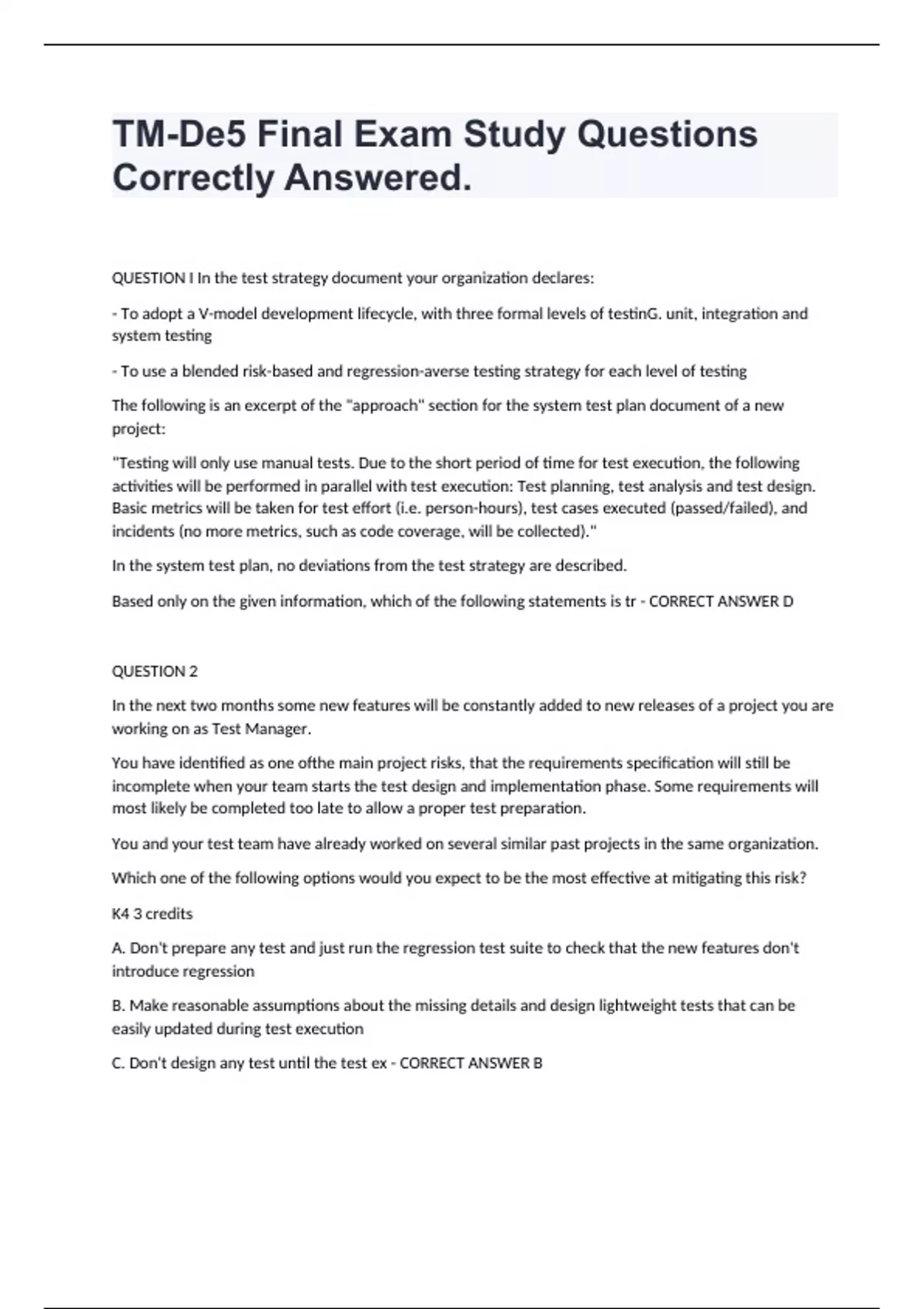 TM-De5 Final Exam Study Questions Correctly Answered. QUESTION I In the test strategy document your organization declares: - To adopt a V-model development lifecycle, with three formal levels of testinG. unit, integration and system testing - To use a blended risk-based and regression-averse testing strategy for each level of testing The following is an excerpt of the "approach" section for the system test plan document of a new project: "Testing will only use manual tests. Due to the short period of time for test execution, the following activities will be performed in parallel with test execution: Test planning, test analysis and test design. Basic metrics will be taken for test effort (i.e. person-hours), test cases executed (passed/failed), and incidents (no more metrics, such as code coverage, will be collected)." In the system test plan, no deviations from the test strategy are described. Based only on the given information, which of the following statements is tr - CORRECT ANSWER D QUESTION 2 In the next two months some new features will be constantly added to new releases of a project you are working on as Test Manager. You have identified as one ofthe main project risks, that the requirements specification will still be incomplete when your team starts the test design and implementation phase. Some requirements will most likely be completed too late to allow a proper test preparation. You and your test team have already worked on several similar past projects in the same organization. Which one of the following options would you expect to be the most effective at mitigating this risk? K4 3 credits A. Don't prepare any test and just run the regression test suite to check that the new features don't introduce regression B. Make reasonable assumptions about the missing details and design lightweight tests that can be easily updated during test execution C. Don't design any test until the test ex - CORRECT ANSWER B QUESTION 3 Consider the following test strategies: I. Consultative test strategy Il. Reactive test strategy Ill. Analytical test strategy IV. Process-compliant test strategy Consider also the following examples of test activities: I. Prioritize the test cases, based on the results of a FMEA analysis, to ensure early coverage of the most important areas and discovery of the most important defects during test execution 2. Execute usability testing driven by the guidance ofa sample of users (external to the test team) 3. Perform exploratory testing sessions throughout the system test phase 4. On an Agile project, execute tests that cover the test conditions identified for each user story of a feature planned for an iteration Which of the following correctly matches each test strategy with an appropriate example? K2 1 credit B. 1-2; 11-3; 111-4; IV-I C. 1-3; 11-2; 111-1; IV-4 D. 1-1; 11-2; 111-3; IV-4 E. 1-2; 11-3; 111 - CORRECT ANSWER E