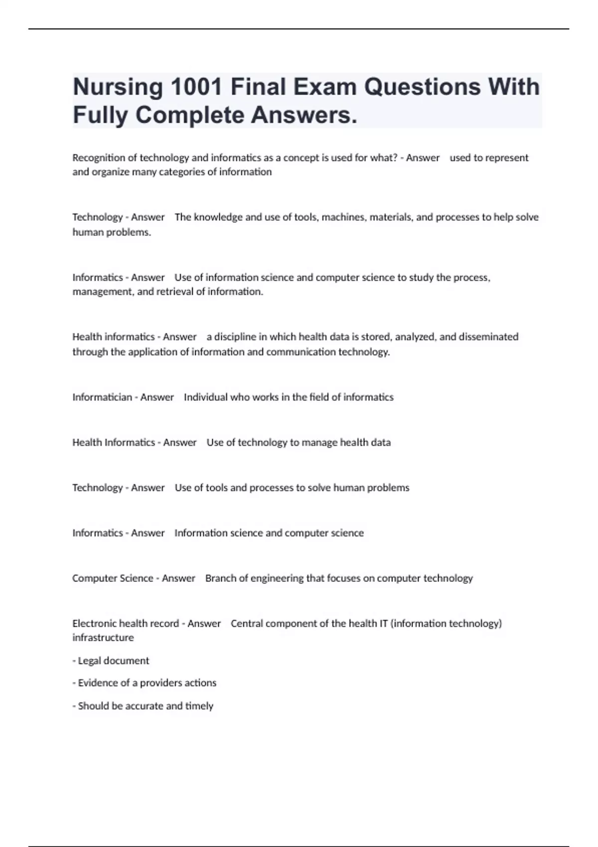 Recognition of technology and informatics as a concept is used for what? - Answer used to represent and organize many categories of information Technology - Answer The knowledge and use of tools, machines, materials, and processes to help solve human problems. Informatics - Answer Use of information science and computer science to study the process, management, and retrieval of information. Health informatics - Answer a discipline in which health data is stored, analyzed, and disseminated through the application of information and communication technology. Informatician - Answer Individual who works in the field of informatics Health Informatics - Answer Use of technology to manage health data Technology - Answer Use of tools and processes to solve human problems Informatics - Answer Information science and computer science Computer Science - Answer Branch of engineering that focuses on computer technology Electronic health record - Answer Central component of the health IT (information technology) infrastructure - Legal document - Evidence of a providers actions - Should be accurate and timely - Major for the communication btw team members