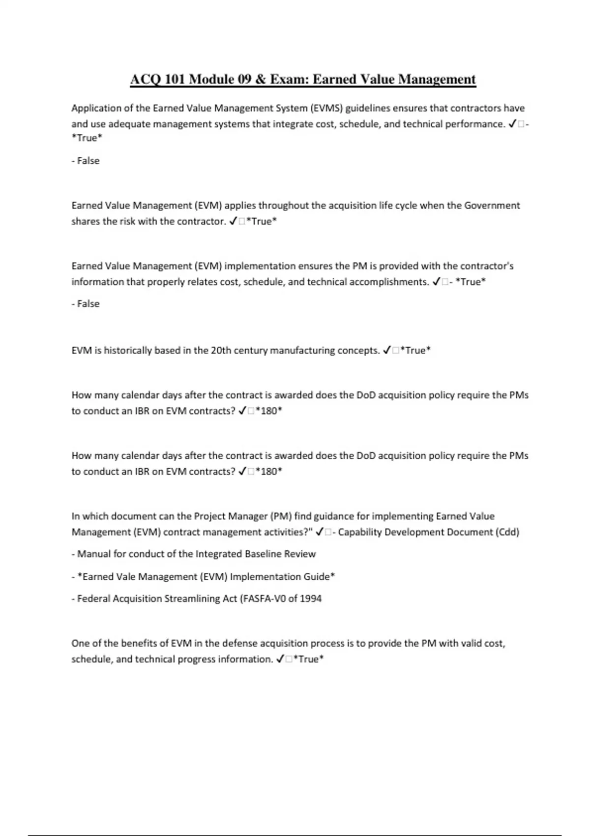 ACQ 101 Module 09 & Exam: Earned Value Management Application of the Earned Value Management System (EVMS) guidelines ensures that contractors have and use adequate management systems that integrate cost, schedule, and technical performance. ️- *True* - False Earned Value Management (EVM) applies throughout the acquisition life cycle when the Government shares the risk with the contractor. ️*True* Earned Value Management (EVM) implementation ensures the PM is provided with the contractor's information that properly relates cost, schedule, and technical accomplishments. ️- *True* - False EVM is historically based in the 20th century manufacturing concepts. ️*True* How many calendar days after the contract is awarded does the DoD acquisition policy require the PMs to conduct an IBR on EVM contracts? ️*180* How many calendar days after the contract is awarded does the DoD acquisition policy require the PMs to conduct an IBR on EVM contracts? ️*180* In which document can the Project Manager (PM) find guidance for implementing Earned Value Management (EVM) contract management activities?" ️- Capability Development Document (Cdd) - Manual for conduct of the Integrated Baseline Review - *Earned Vale Management (EVM) Implementation Guide* - Federal Acquisition Streamlining Act (FASFA-V0 of 1994 One of the benefits of EVM in the defense acquisition process is to provide the PM with valid cost, schedule, and technical progress information. ️*True* The Contract Funds Status Report provides the PMs which of the following information? (Select all that apply) ️*Rough estimates of termination costs* *Planned or requested funding changes in contracts* *Budget estimates in support of approved programs* The difference between the contractor and the Government calculating EAC is that the contractor's EAC is normally derived from updating EACs at the control account level and summarized up the WBS structure allowing for an EAC at any level. The Government uses formulas based on contractor performance metrics to calculate EACs. These formulas can be used to predict the EAC based upon the past history of contractor performance on the contract. ️*True* The Electronics Industries Alliance Standard 748 (EIA-748) defines the 32 EVM guidelines. What document is used as the basis for the DoD to assess EVMS compliance? ️- The Government program manager's acquisition strategy - Government Performance and Results Act (GPRA) of 1993 - *DoD Earned Value Management Systems Interpretation Guide (EVMSIG)* - Department of Defense Instruction (DoDI) 5000.02, Enclosure 1 The EVMS guidelines identified by EIA-748 address how many management processes? ️*9* The Government's Earned Value Estimate at Completion (EAC) formula is based on the amount of money already spent on the contract plus which other amount of money? ️- The amount it will take to extend the project - *The amount it will take to complete the project* - The amount it will take to change the project - The amount it will take to implement the project The IBR is a tool that should be used as necessary throughout the life of the contract. ️- *True* - False The Integrated Program Management Report (IPMR) provides performance data; which of the following does the Contract Funds Status Report (CFSR) provide? ️- Facilities data - Supply data - *Funding data* - Capability data The IPMR provides performance data that are used to identify problems early in