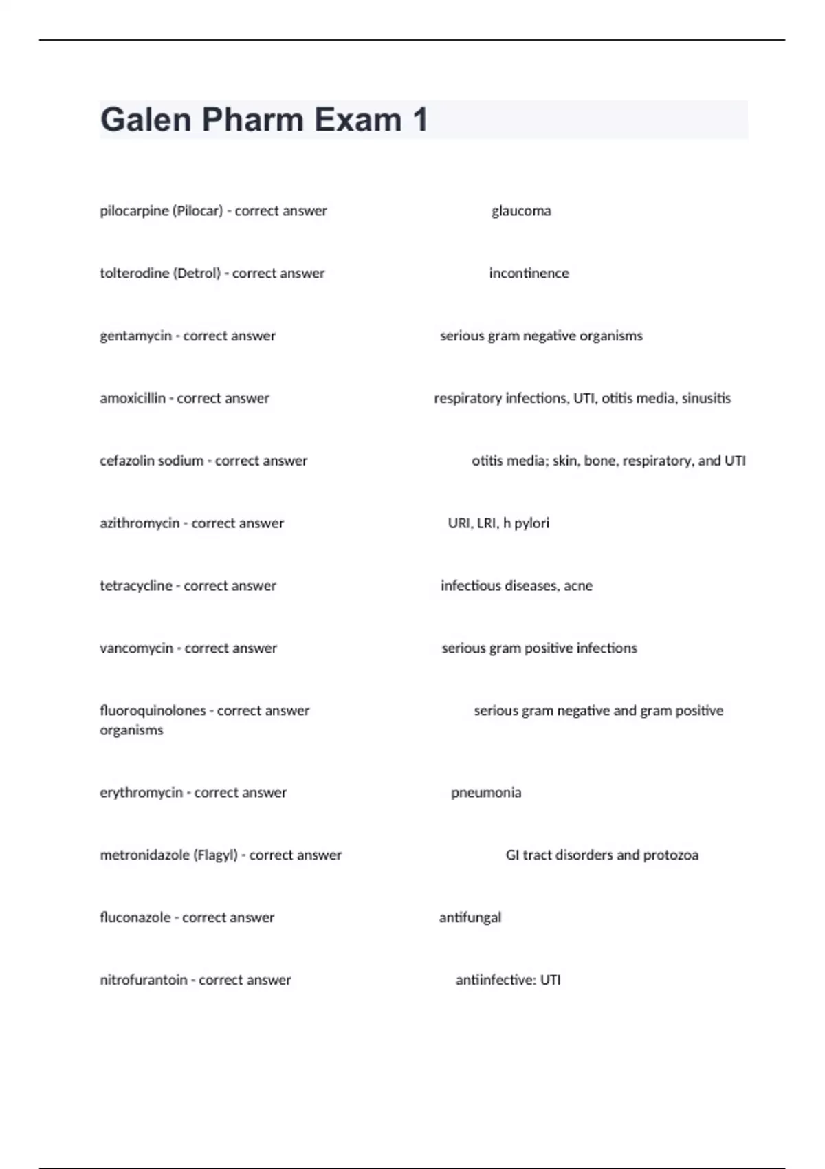pilocarpine (Pilocar) - correct answer glaucoma tolterodine (Detrol) - correct answer incontinence gentamycin - correct answer serious gram negative organisms amoxicillin - correct answer respiratory infections, UTI, otitis media, sinusitis cefazolin sodium - correct answer otitis media; skin, bone, respiratory, and UTI azithromycin - correct answer URI, LRI, h pylori tetracycline - correct answer infectious diseases, acne vancomycin - correct answer serious gram positive infections fluoroquinolones - correct answer serious gram negative and gram positive organisms erythromycin - correct answer pneumonia metronidazole (Flagyl) - correct answer GI tract disorders and protozoa fluconazole - correct answer antifungal nitrofurantoin - correct answer antiinfective: UTI TMP SMX ( trimethoprin-sulfamethoxazole) (bactrim) (sulfonamide) - correct answer sulfonamide: UTI phenazopyridine HCl (Pyridium) - correct answer urinary analgesic epinephrine - correct answer anaphylaxis albuterol - correct answer COPD bethanechol chloride - correct answer urinary retention benztropine (Cogentin) - correct answer Parkinson's atropine - correct answer dilate pupils nystatin - correct answer thrush acyclovir - correct answer herpes tetracycline - correct answer side effect: teeth discoloration in children metronidazole (Flagyl) - correct answer side effect: dark or red brown urine erythromycin - correct answer side effect: conjunctivitis nystatin - correct answer swish and swallow nitrofurantoin - correct answer side effects: peripheral neuropathy, drowsiness TMP SMX (trimethoprin-sulfamethoxazole) (bactrim) (sulfonamide) - correct answer side effects: photosensitivity, blood dyscrasia acyclovir - correct answer side effect: gingival hyperplasia phenazopyridine HCl (Pyridium) - correct answer side effects: harmless red orange urine, can alter glucose urine test, GI disturbances adrenergic agonists (epinephrine, albuterol) - correct answer drug class::side effects: HT and TACH cholinergics (bethanechol, pilocarpine) - correct answer drug class::side effects: orthostatic hypotension, bradycardia, miosis, increased exocrine function, bronchial constriction anticholinergics (benztropine, tolterodine, atropine) - correct answer drug class::side effects: decreased exocrine function, restlessness, dizziness, mydriasis, weakness tolterodine (Detrol) - correct answer grapefruit juice may increase drug levels aminoglycosides (gentamycin) - correct answer drug class::side effects: photosensitivity, tinnitus, hearing loss penicillins (amoxicillin) - correct answer drug class::side effects: edema, insomnia, dysphagia, respiratory distress cephalosporins (cefazolin sodium) - correct answer drug class::side effects: anorexia, n/v/d, superinfection, SJS metronidazole (Flagyl) - correct answer disulfiram reaction with alcohol macrolides (azithromycin) - correct answer drug class::side effects: blurred vision, h/a, drowsiness, dizzi
