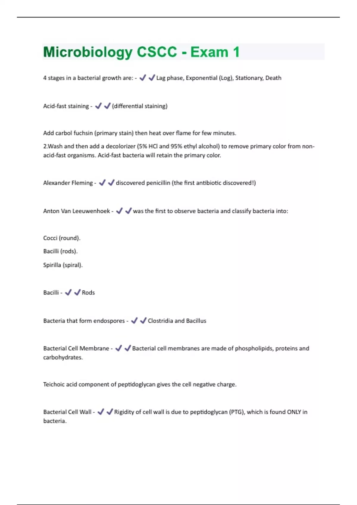 4 stages in a bacterial growth are: - Lag phase, Exponential (Log), Stationary, Death Acid-fast staining - (differential staining) Add carbol fuchsin (primary stain) then heat over flame for few minutes. 2.Wash and then add a decolorizer (5% HCl and 95% ethyl alcohol) to remove primary color from nonacid-fast organisms. Acid-fast bacteria will retain the primary color. Alexander Fleming - discovered penicillin (the first antibiotic discovered!) Anton Van Leeuwenhoek - was the first to observe bacteria and classify bacteria into: Cocci (round). Bacilli (rods). Spirilla (spiral). Bacilli - Rods Bacteria that form endospores - Clostridia and Bacillus Bacterial Cell Membrane - Bacterial cell membranes are made of phospholipids, proteins and carbohydrates. Teichoic acid component of peptidoglycan gives the cell negative charge. Bacterial Cell Wall - Rigidity of cell wall is due to peptidoglycan (PTG), which is found ONLY in bacteria.Penicillin acts on the peptidoglycan layer, therefore, it is more effective on Gram positive bacteria. Bacterial Growth - All bacteria are prokaryotic and divide by binary fission Bacterial movement - Active bacterial motion is regulated by flagella Beneficial Bacteria - The majority of the bacteria are beneficial. Only about 3% are harmful. Biofilms - important because pathogenic bacteria in a biofilm resist immune responses and antimicrobials. increase survival and attaching to surfaces. Bright-field Microscope - Uses visible light to observe objects, and produces a maximum magnification of a 1000x. Capsids - found on all viruses, are proteins that surround the nucleic acids. Capsids are made of identical unit proteins called capsomeres. Each virus has a specific number of capsids. Capsules - external viscous structures on surface of some made of sticky glycocalyx (polysaccharide) coating. Capsules contribute to virulence Capsules enhance bacterial adherence to surfaces.Chain and Florey - purified, tested and made production of penicillin in large amounts Chemically defined media - are composed of precise amounts of pure chemicals. Chemolithoautotrophs - use inorganic carbon for energy and CO2 as carbon source Chemoorganoheterotrophs - use organic compounds for energy and carbon source. This is the method used in humans and all other animals. Chronic infections - the virus is present at all times during the infection. Examples of chronic infections are; Hepatitis B and Hepatitis C. Classes of Microbiology - Bacteria, Fungi, Protozoa, Algae and "viruses." Cocci - Round Complex media - have no exact chemical formula of the ingredients in them. Examples include; Nutrient broth, Blood agar, Chocolate agar. Dark-field Microscope - In a dark-field microscope, the object will appear bright on a dark background. Death phase - stage where nutrients are depleted and more bacteria die than are generated. Differential media - contain substance that bacteria change in recognizable way e.g. Blood agar is sued to see hemolysis; MacConkey agar, is used to differentiate lactose fermenters and non fermenters.Diffusion - the process by which molecules move in and out freely across the cytoplasmic membrane (no energy required). DNA viruses - replicate and assemble in the nucleus of the host cell. Domain Archaea - They have similar shapes like bacteria. Cell walls of Archaea do not have peptidoglycan. Some Archaea can grow at 1210C. Archaea can grow in high salt concentration. Domain Bacteria - Are prokaryotes and have rigid cell walls. Have no membrane bound nucleus or organelles. The three most common bacterial shapes are; Cocci, Bacilli, Spiralla. Domain Eukarya - Domain eukarya includes; Algae, Fungi, Protozoa, Animals and Plants. •All Eukaryotes have true cells, i.e. have membrane bound nucleus and organelles. •Eukaryotic cells DO NOT have peptidoglycan. •Algae and fungi have rigid cells. •Algae perform 90% of all photosynthesis •Algae are aquatic, photosynthetic and free living. •Fungi and protozoa depend on other organisms for their energy source. •Protozoan cells do not have rigid cell walls.Edward Jenner - inoculated an 8 year old boy with cowpox and proved vaccine against small pox was effective. Endospores - Only 1 endospore per cell is produced. Bacterial endospores are the most resistant life forms. Endospores withstand extreme heat, drying, freezing, radiation, and chemicals. Essential elements and Trace elements required for bacterial growth: - •Essential elements required for growth are Carbon, oxygen, hydrogen, nitrogen, sulfur, phosphorus, potassium, magnesium, calcium and iron. •Trace elements are required for growth but are needed in small amounts e.g. Cobalt, Examples of benefits we get from bacteria and fungi include - Bacteria and fungi decay organic matter. Most antibiotics are made by bacteria and fungi. Normal flora contribute to health. Intestinal bacteria are involved in production of vitamins K & vitamin B. Bacteria are used to make ethanol, pesticides and dietary amino acids. Bacteria degrade oils, clean natural and artificial oil spills. More than 50% of photosynthesis is performed by microorganisms.Facultative anaerobes - can live in the presence or absence of oxygen. They catalase and superoxide desmutase. Their metabolism can occur by aerobic respiration or anaerobically by fermentation. Ferdinand Cohn - discovery of endospores fimbriae - used for attachment rather than for movement.