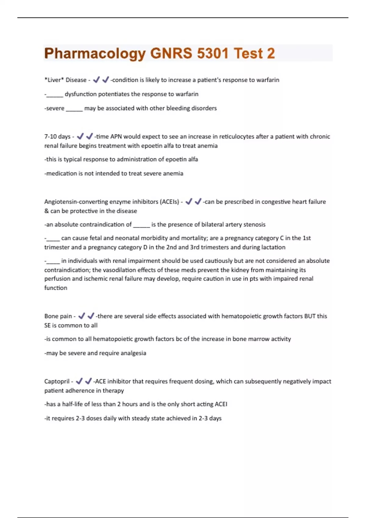 *Liver* Disease - -condition is likely to increase a patient's response to warfarin -_____ dysfunction potentiates the response to warfarin -severe _____ may be associated with other bleeding disorders 7-10 days - -time APN would expect to see an increase in reticulocytes after a patient with chronic renal failure begins treatment with epoetin alfa to treat anemia -this is typical response to administration of epoetin alfa -medication is not intended to treat severe anemia Angiotensin-converting enzyme inhibitors (ACEIs) - -can be prescribed in congestive heart failure & can be protective in the disease -an absolute contraindication of _____ is the presence of bilateral artery stenosis -____ can cause fetal and neonatal morbidity and mortality; are a pregnancy category C in the 1st trimester and a pregnancy category D in the 2nd and 3rd trimesters and during lactation -____ in individuals with renal impairment should be used cautiously but are not considered an absolute contraindication; the vasodilation effects of these meds prevent the kidney from maintaining its perfusion and ischemic renal failure may develop, require caution in use in pts with impaired renal function Bone pain - -there are several side effects associated with hematopoietic growth factors BUT this SE is common to all -is common to all hematopoietic growth factors bc of the increase in bone marrow activity -may be severe and require analgesia Captopril - -ACE inhibitor that requires frequent dosing, which can subsequently negatively impact patient adherence in therapy -has a half-life of less than 2 hours and is the only short acting ACEI -it requires 2-3 doses daily with steady state achieved in 2-3 daysCiprofloxacin - -Ex: APN is treating a 14 yo pt for a complicated UTI, APN notes on urine culture & sensitivity report that organism is only susceptible to quinolone; this quinolone should be prescribed -fluoroquinolones are not recommended in pedi pts bc of concern for joint disorders; only exception is _____, which can be prescribed as 2nd-line therapy in complicated UTIs & pyelonephritis in children ages 1 yr-17 yo Clopidogrel - -aspirin is known to increase this meds effectiveness -drugs that inhibit CYP2C19 (ex: cimetidine) are known to decrease effectiveness of med -proton pump inhibitors (ex: omeprazole) are known to decrease effectiveness of med Clopidogrel (75mg daily) - Dabigatran (Pradaxa) - -categorized as a direct thrombin inhibitor -works as a direct thrombin inhibitor to prevent conversion of fibrinogen to fibrin to prevent thrombus formation Epoetin alfa - -medication indicated to increase baseline hemoglobin prior to blood donation -is indicated for this process when iron stores are intact Low molecular weight heparin (LMWH) - -Ex: a pt w/ breast cancer presents to the ED w/ a DVT, she will require anticoagulation, appropriate tx regimen=_____ for 3 months -in pts w/ cancer who develop DVT or PE, _____ is recommended for long-term therapy over warfarin, dabigatran, rivaroxaban, apixaban, or edoxaban Nasal polyps - -patient with this is at greatest risk for hypersensitivity to aspirin or NSAIDs -aspirin sensitivity is more common in patients with asthma, ____, or chronic uticaria -hypersensitivity or cross sensitivity with aspirin may occur with NSAIDs Nifedipine - -CCB= drug of choice during lactation if CCB is required -is excreted at less than 5% in breast milk, making it the DOC during lactation if CCB is requiredOmega-3 carboxylic acid drug group - Approved for cases of high triglycerides that do not respond to primary interventions Pregnant women - -use of warfarin is not recommended for _____ by ACCP; warfarin is a known teratogen & should NOT be given during first trimester -warfarin is known teratogen & may cause fetal bleeding -use of heparin or LMWH are both options for ____ requiring anticoagulation