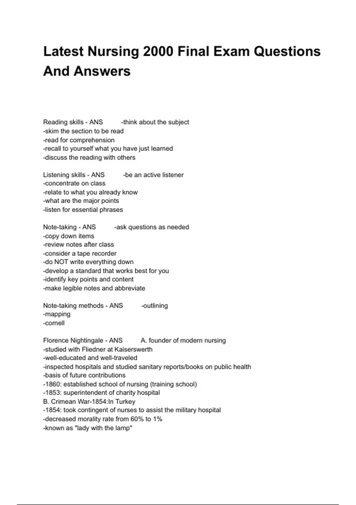 Reading skills - ANS -think about the subject -skim the section to be read -read for comprehension -recall to yourself what you have just learned -discuss the reading with others Listening skills - ANS -be an active listener -concentrate on class -relate to what you already know -what are the major points -listen for essential phrases Note-taking - ANS -ask questions as needed -copy down items -review notes after class -consider a tape recorder -do NOT write everything down -develop a standard that works best for you -identify key points and content -make legible notes and abbreviate Note-taking methods - ANS -outlining -mapping -cornell Florence Nightingale - ANS A. founder of modern nursing -studied with Fliedner at Kaiserswerth -well-educated and well-traveled -inspected hospitals and studied sanitary reports/books on public health -basis of future contributions -1860: established school of nursing (training school) -1853: superintendent of charity hospital B. Crimean War-1854:In Turkey -1854: took contingent of nurses to assist the military hospital -decreased morality rate from 60% to 1% -known as "lady with the lamp" -thought to be the first nurse researcher -concerned with the character of nurses C. Values -nurses were to nurse and nursing should be in charge of nursing -promoted lifelong learning -men=women -stressed importance of nursing assessment/reporting -differentiated sick nursing vs. health nursing Best learning style - ANS -visual -auditory -reading -kinesthetic Preparing to study - ANS -adequate setting -books and supplies -study most difficult subject first -set study goals (2-3 hours to study for every 1 credit hour) Study skills - ANS -avoid procrastination and distractions -study set time then take a break -if tired or bored, switch task or subject -study with friends or in groups -develop time-use chart -read text before and after class -develop mnemonics Exam preperation - ANS -begin to study early -identity effective review methods -review study guides, notes and text -"teach" classmates -repetition Multiple choice - ANS -review stem carefully, look for negatives -note "priority" and "first action" -no clue=b or c -look at all answers before choosing Essay - ANS -make easy to read -create mini outline -answer what the question asks -do NOT add extraneous content Test anxiety - ANS -tense muscles -headache -sweaty palms -upset stomach -fast heart rate -shortness of breath Stress management - ANS -learn to relax -deep breathing -laugh -aromatherapy -visualization -positive affirmations -practice acceptance -become organized -healthy habits -build up support system -balance -do NOT work excessive hours Nursing in the USA - ANS 1. Pre-Civil War -similar to Europe standards *Dorothea Dix: improved care for mentally ill 2. Civil War -no organized system to care for sick -lay nurses provided care -minimal support from physicians