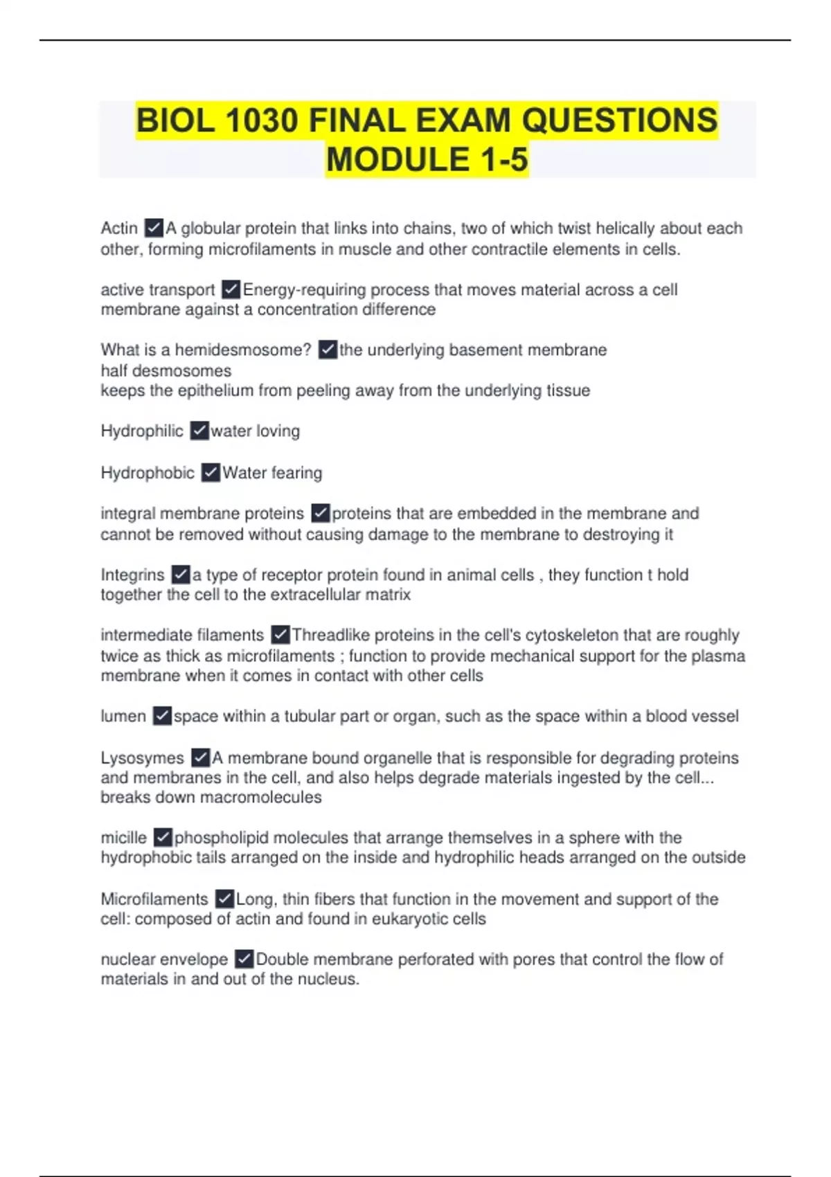 Actin A globular protein that links into chains, two of which twist helically about each other, forming microfilaments in muscle and other contractile elements in cells. active transport Energy-requiring process that moves material across a cell membrane against a concentration difference What is a hemidesmosome? the underlying basement membrane half desmosomes keeps the epithelium from peeling away from the underlying tissue Hydrophilic water loving Hydrophobic Water fearing integral membrane proteins proteins that are embedded in the membrane and cannot be removed without causing damage to the membrane to destroying it Integrins a type of receptor protein found in animal cells , they function t hold together the cell to the extracellular matrix intermediate filaments Threadlike proteins in the cell's cytoskeleton that are roughly twice as thick as microfilaments ; function to provide mechanical support for the plasma membrane when it comes in contact with other cells lumen space within a tubular part or organ, such as the space within a blood vessel Lysosymes A membrane bound organelle that is responsible for degrading proteins and membranes in the cell, and also helps degrade materials ingested by the cell... breaks down macromolecules micille phospholipid molecules that arrange themselves in a sphere with the hydrophobic tails arranged on the inside and hydrophilic heads arranged on the outside Microfilaments Long, thin fibers that function in the movement and support of the cell: composed of actin and found in eukaryotic cells nuclear envelope Double membrane perforated with pores that control the flow of materials in and out of the nucleus.